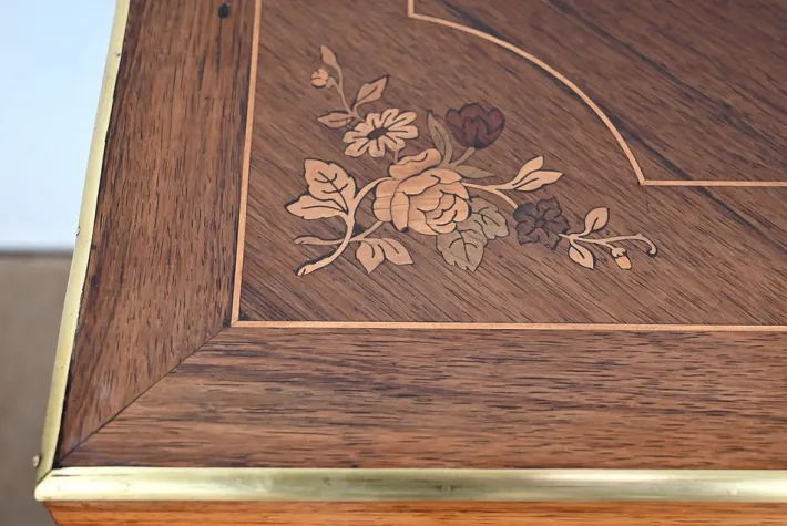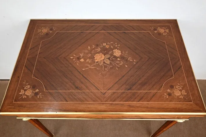 Placing belts, arranged in butterfly wings, are marked with compositions in the same spirit and underlined by a brass molding with the ridge. There is, on the side, a drawer equipped with an original functional lock with key and encrusted input. It unveils two felted spaces, printed with a tric-trac game, and three tokens.