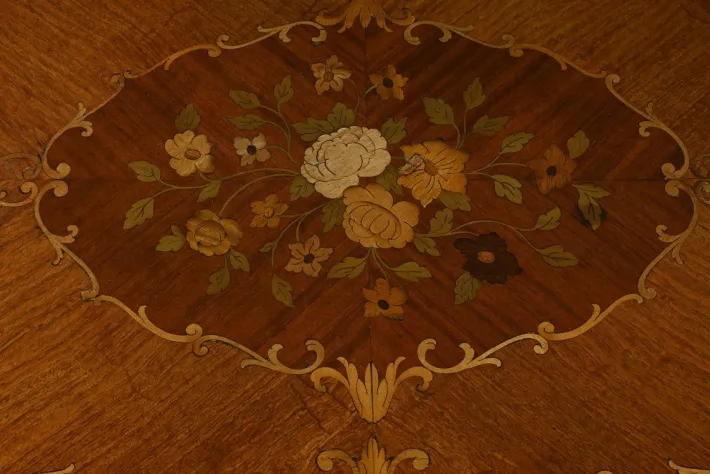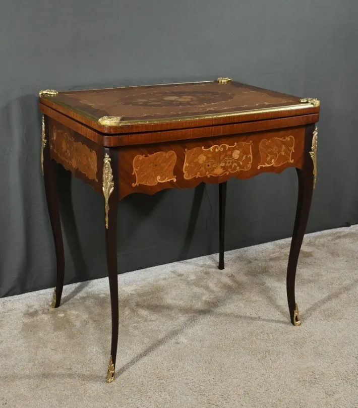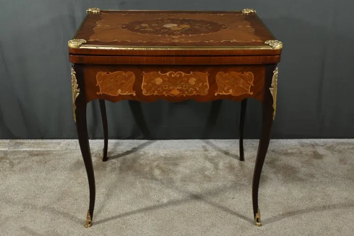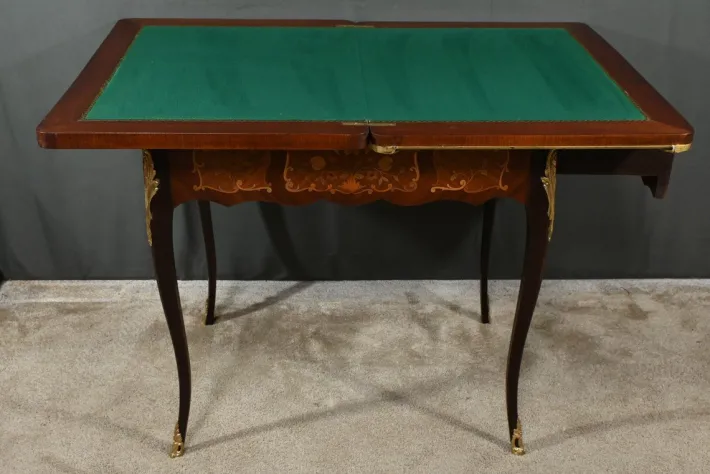 Its top, magnificently decorated with marquetry decorated with flowers, is highlighted by an ingot mold and bronze corner motifs, adding a touch of elegance and refinement. When unfolded, the top reveals a games table dressed in green felt and braid, perfect for friendly game evenings.