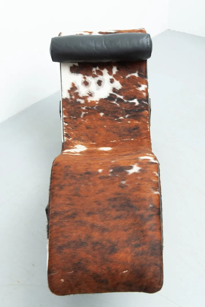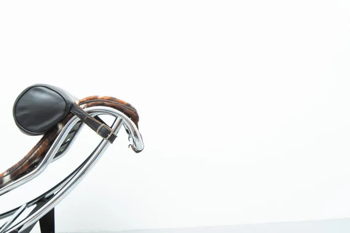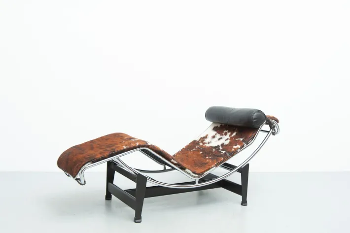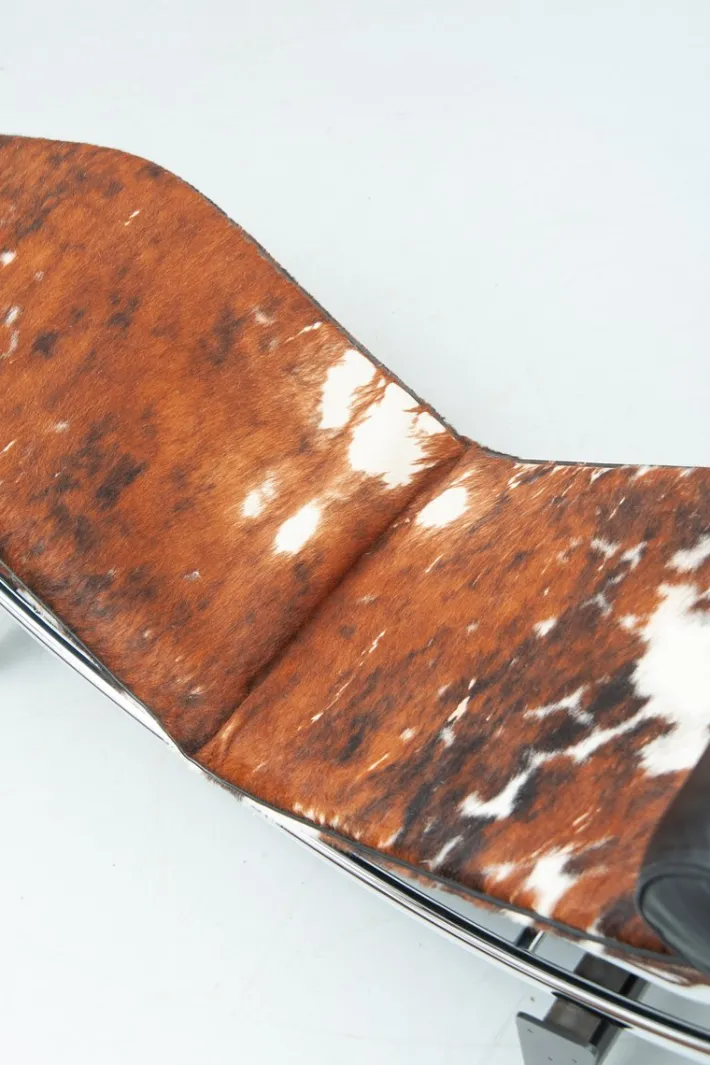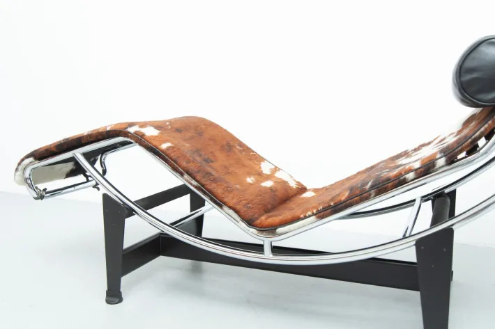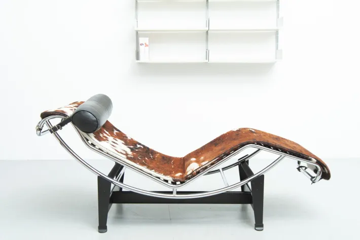 The chrome-plated steel frame rests loosely on a black base and is infinitely adjustable – from upright to reclining. The lounger is covered in hide leather. The LC4 has been produced by Cassina since 1964.