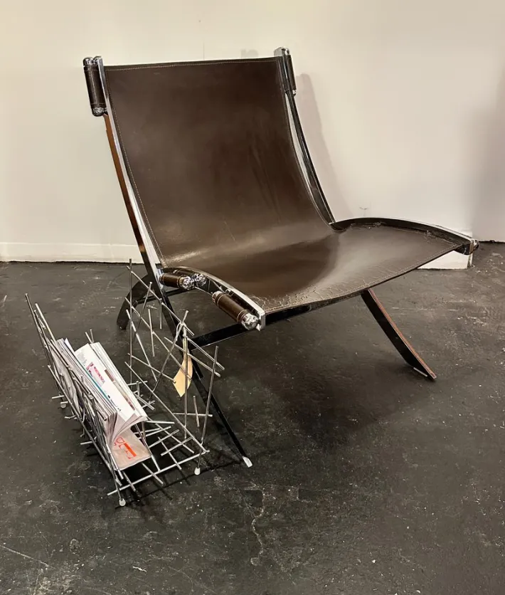 The frame consists of one piece of solid chromed steel. The leather seat is masterfully created by saddle-makers who worked with Flexform and it’s afixed to the frame on 6 points by chrome cylinder shaped capsules that are hand stitched in situe.
