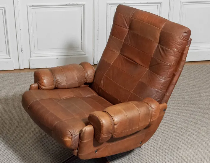 This striking chair is upholstered in cognac-brown leather with a distinctive patchwork design, giving it a bold and timeless presence. The chair feature generously padded armrests, deep seating, and stitched detailing that enhances both comfort and style.