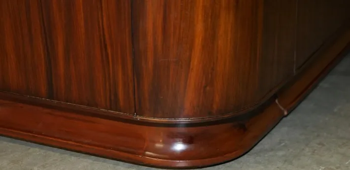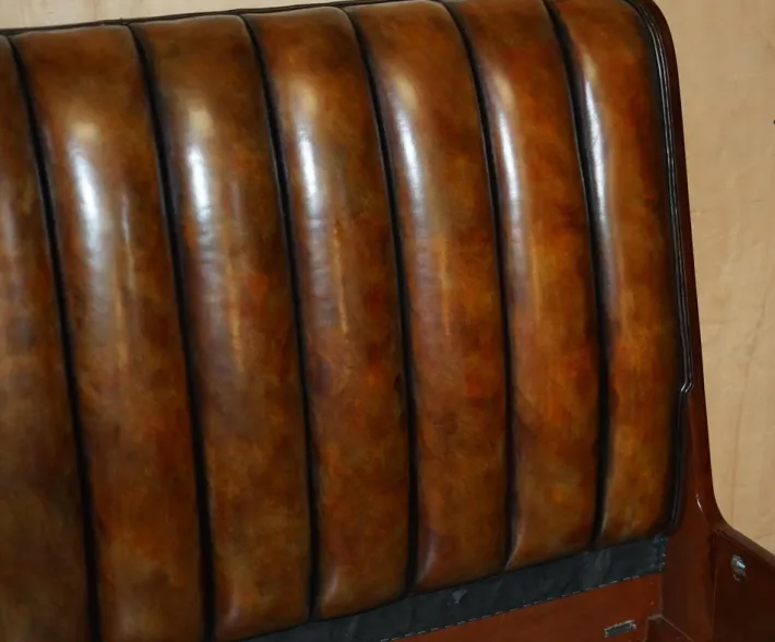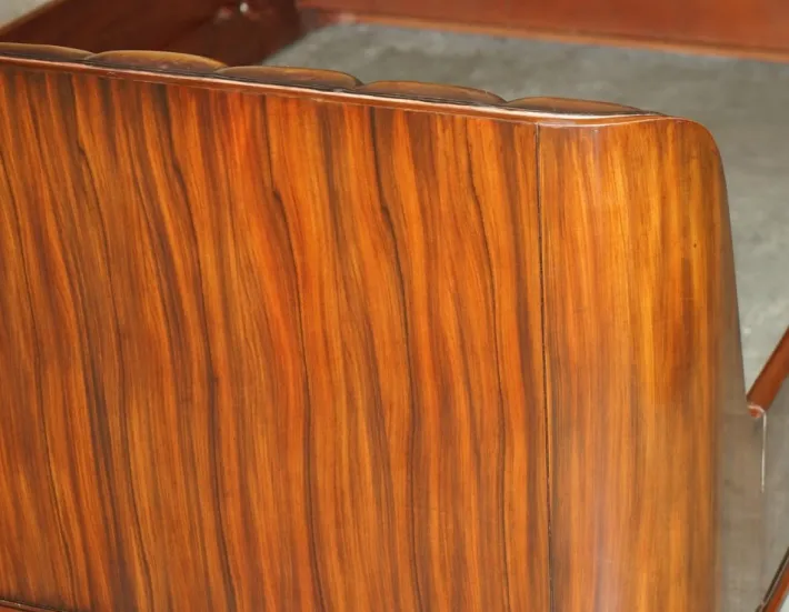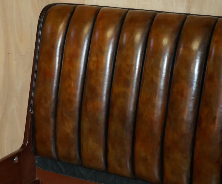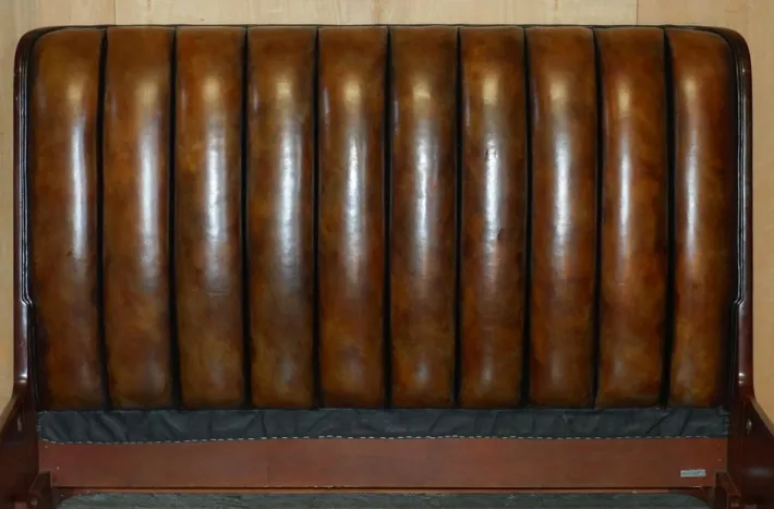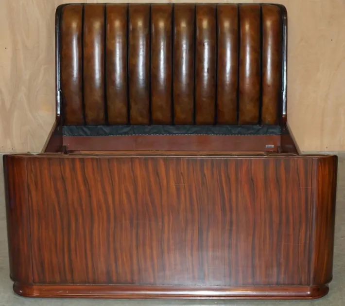 A very good looking, extremely comfortable and well-made bed, this model is now discontinued, it is pretty much the best looking example I have ever seen in real life, the frame is glorious golden Macassar, the upholstery is heritage leather which has an exquisite patina having been fully restored The bed comes with the head and footboard and two side rails, you will need two or three cross bars of timber, I can supply these for a small cost should the new owners wish, then a Divan base of your choosing and of course the mattress The bed is a UK Queen size so it takes a 160cm wide and 200cm long mattress which is a very good size Condition wise we have deep cleaned hand condition waxed and hand polished the timber, there will be some light transport and storage marks here and there but really its in nice order indeed, the upholstery has been fully restored to include being washed back, hand dyed six times, antiqued, sealed, washed back and polished, it is in exquisite order throughout