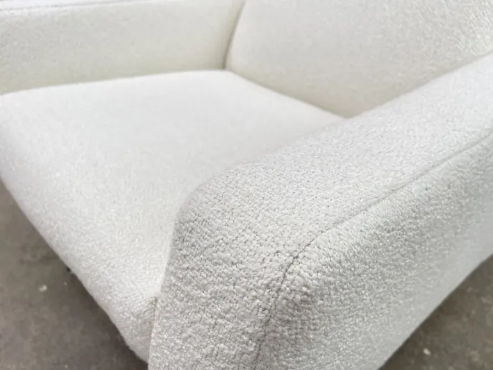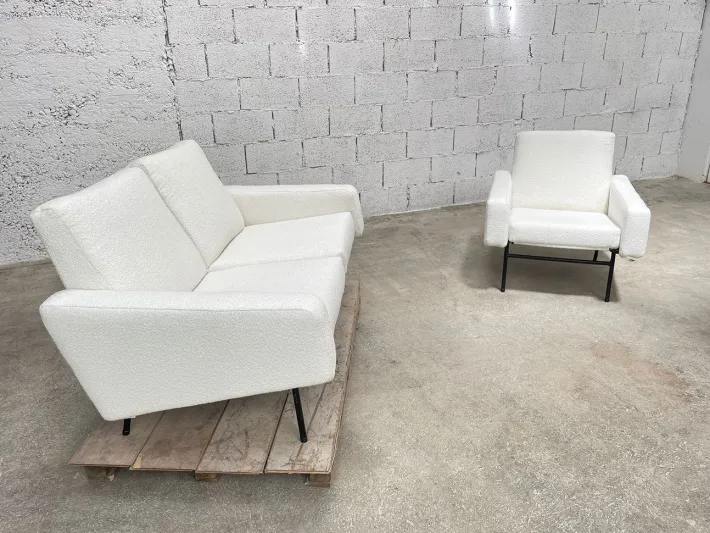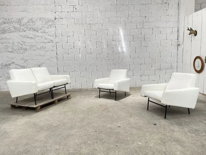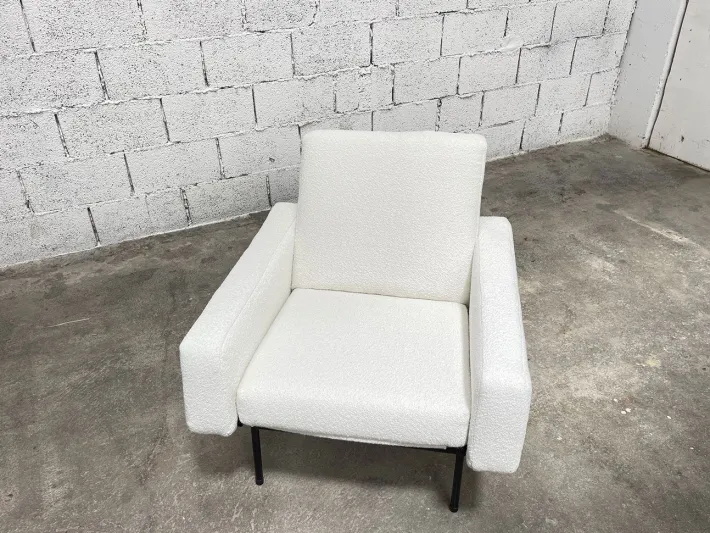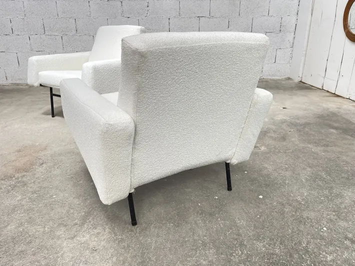 Black lacquered metal structure and mottled white fabric for this set, entirely reupholstered in our workshops.