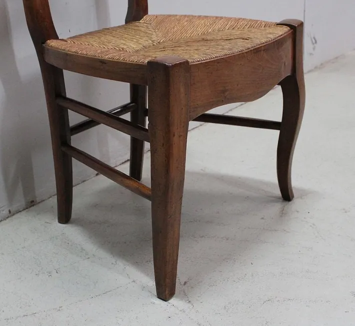 It rests on two curved feet at the front, and at the back on two straight feet, less pronounced spacing. This chair is reinforced by the presence of a pair of bars on each of its sides, a single on the back. A large crossing discreetly songwrited composes the front facade.