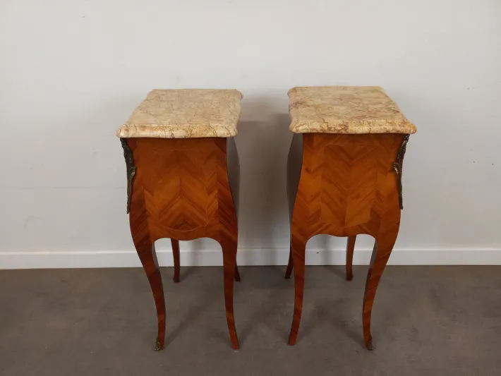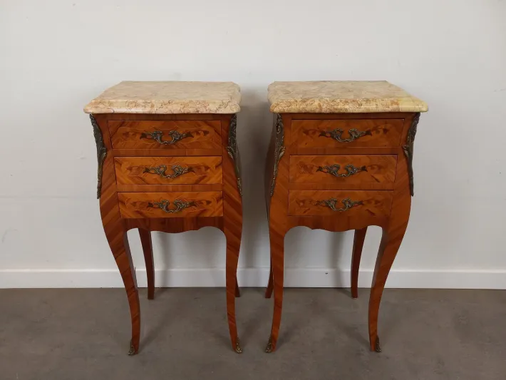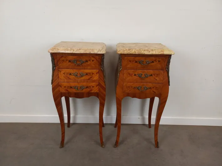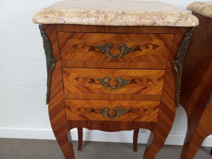 | Restoration and Damage Details | Light wear consistent with age and use, Patina consistent with age and use, A slight lack of varnish on one of the bedside drawers, New marble tops |