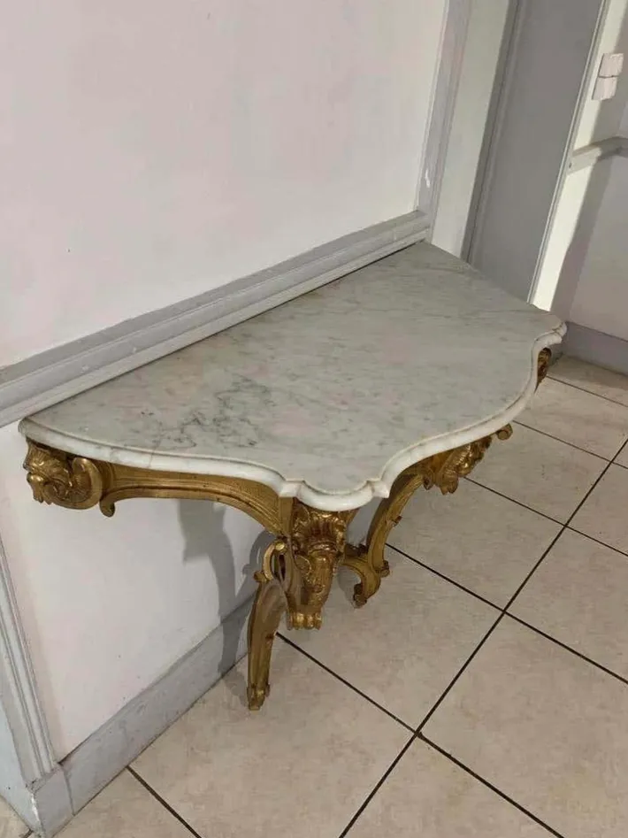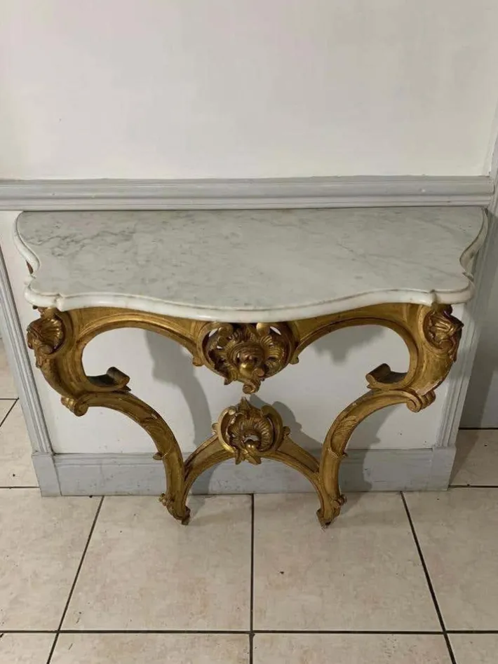 Composed of many golden volutes, this console reminds us of the finesse and delicacy of this style. The feet are decorated with acanthus leaves and shells.