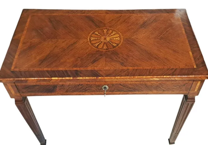 Inlays and Decorations: The top features a circular medallion inlaid in boxwood and rosewood at its center, depicting a sunburst floral motif, a typical neoclassical decoration.