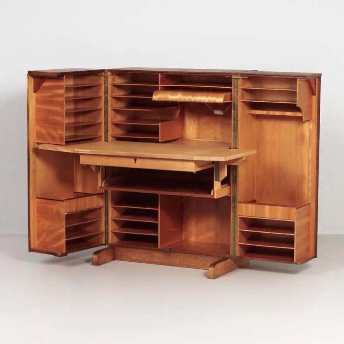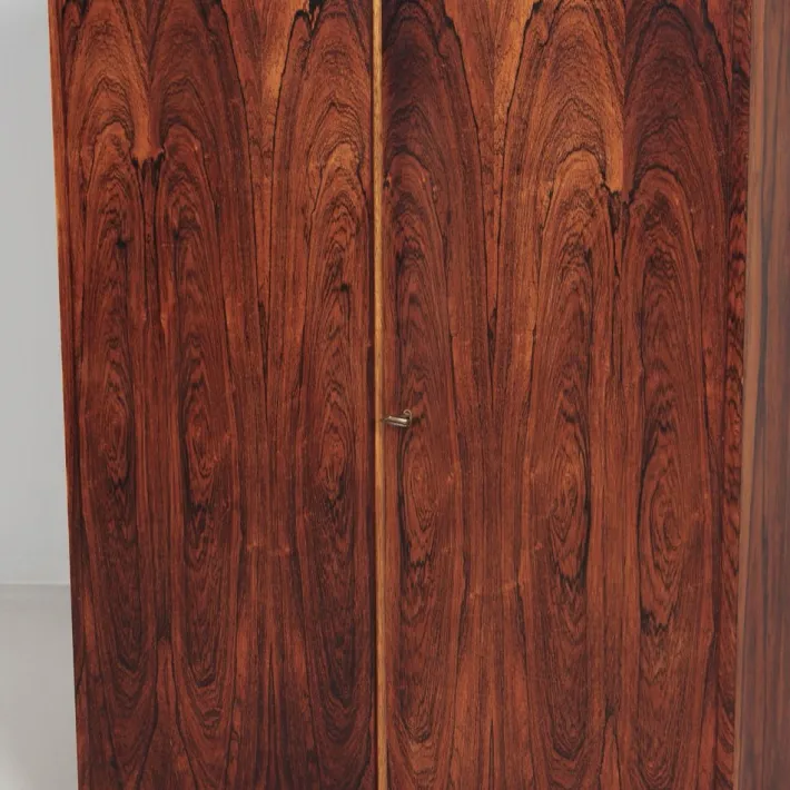 Dimensions closed: 83 x 55 x 114 (h) cm, unfolded: 167 x 74 x 114 (h) cm. The condition of this Magic Box desk is very good, with light signs of use consistent with its age. The piece has been given a new wax layer which highlights the striking rosewood grain. All functions operate properly, including both locks with the original key. The integrated lighting has been checked by an electrician and is in goed condition.