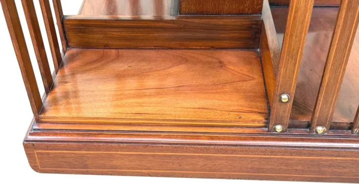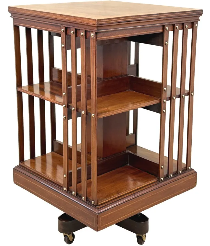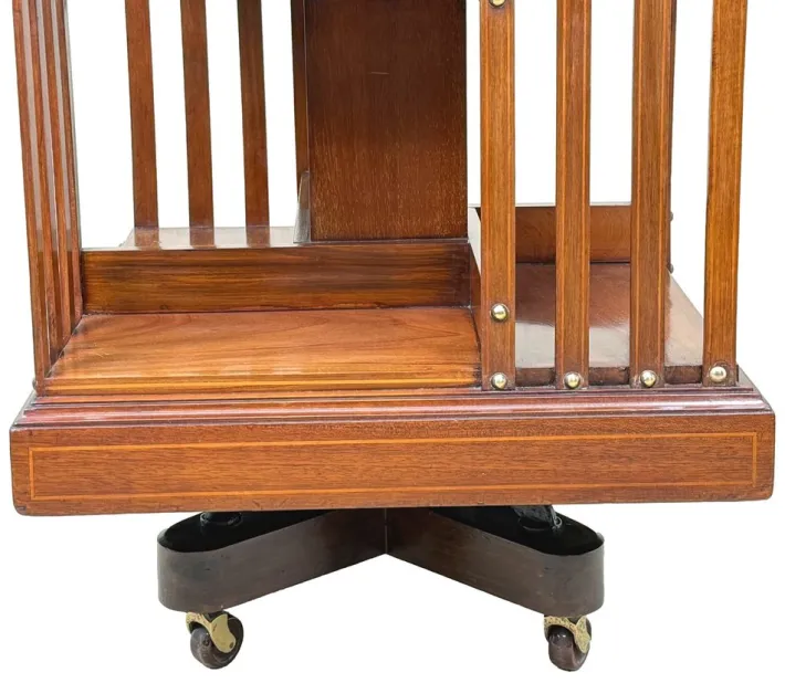 These bookcases became extremely popular and can be found in a huge variety of designs and quality now. As a general rule any with inlaid decoration and the metal support bases are regarded as the best of their type as they boast bothe elegance and practicality. You will note that this particular revolving bookcase has some attractive crossbanded decoration, which in combination with the lovely figured mahogany makes it very elegant indeed. It also has a metal base and this adds to the practicality, making it very sturdy indeed.