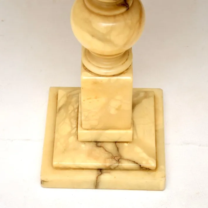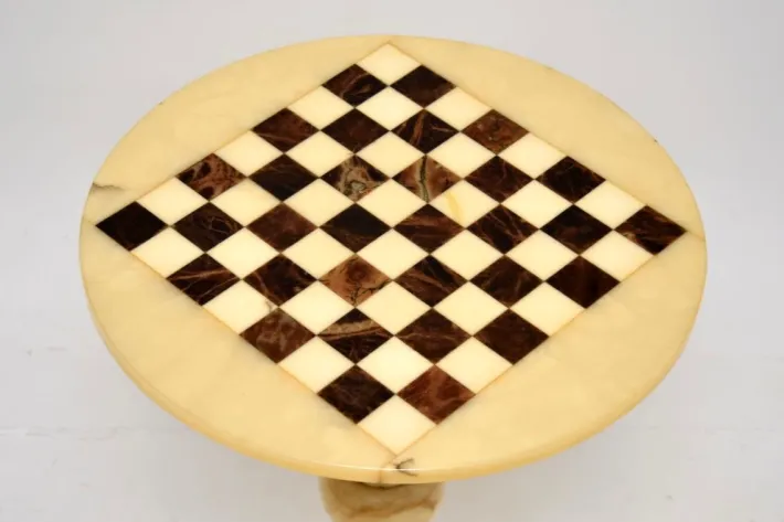 It is of outstanding quality, the circular top is inlaid with contrasting checkered colours of marble which make the chess board. The base is beautifully turned from solid marble, the top can unbolt and detach from the base.