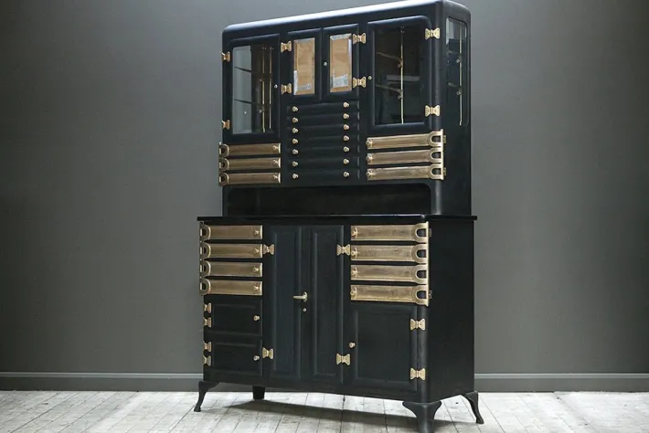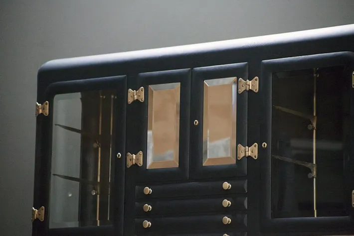 Above, a display cabinet with glass doors and glass side panels and middle mirrored section above seven drawers.