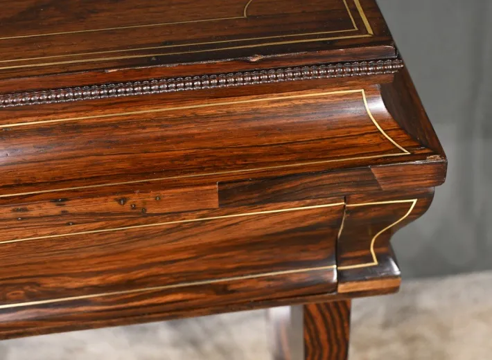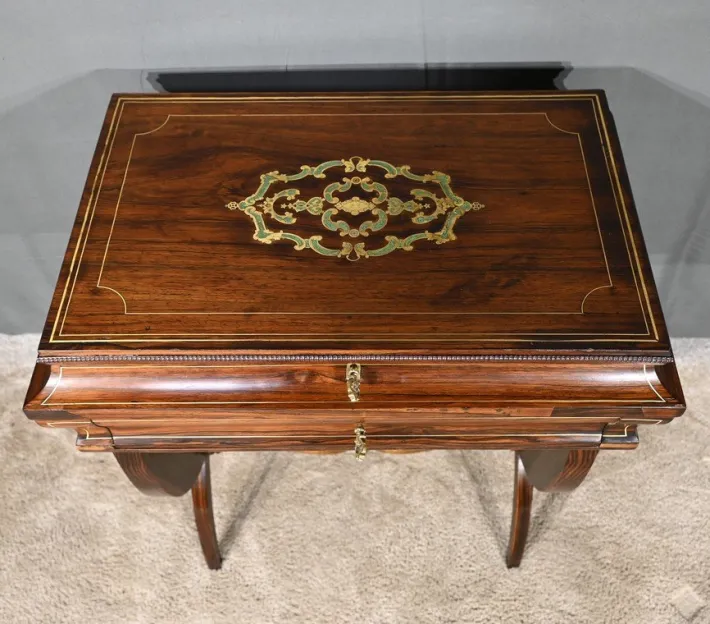 It opens with a drawer in an animated belt, decorated with brass threads, with an authentic lock and inlaid brass entrance accompanied by its key.