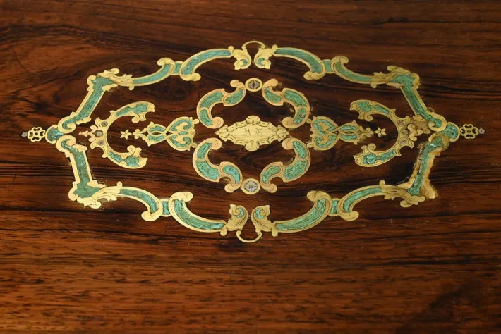This top, mounted on hinges and compasses, lifts to reveal an interior mercury mirror and an original two-point lock with inlaid entrance and key.
