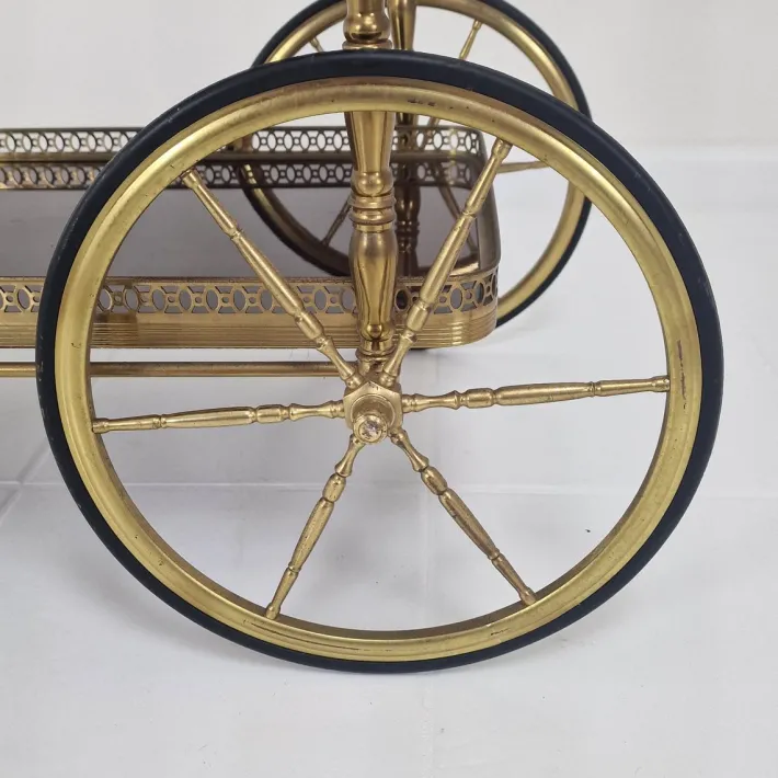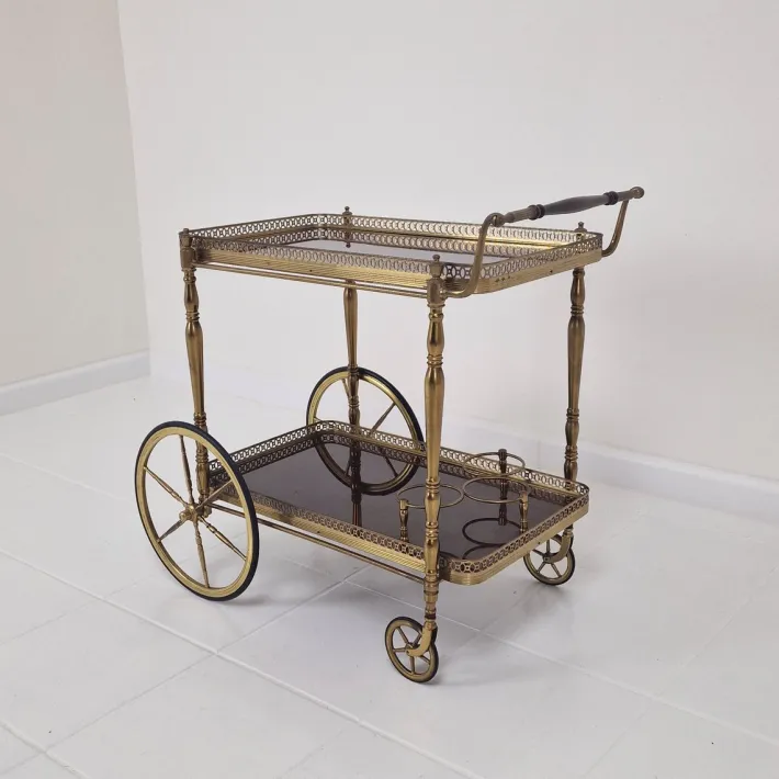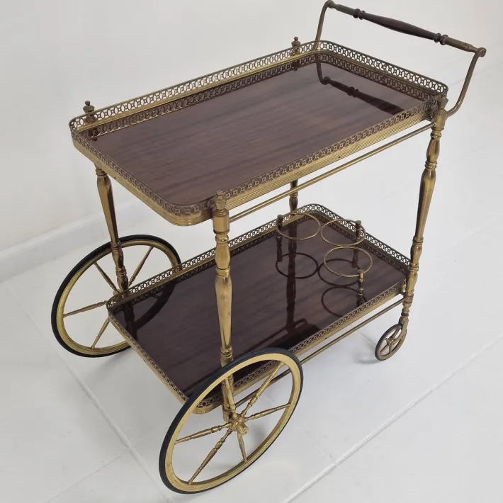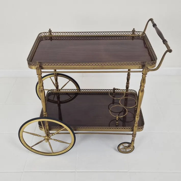 This eye-catching cart, with its duo of polished wood tiers and openwork brass galleries, has a neo-classical feel to its design.