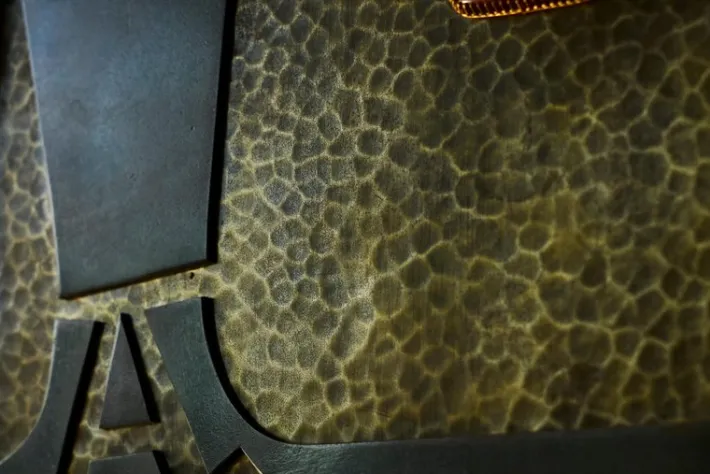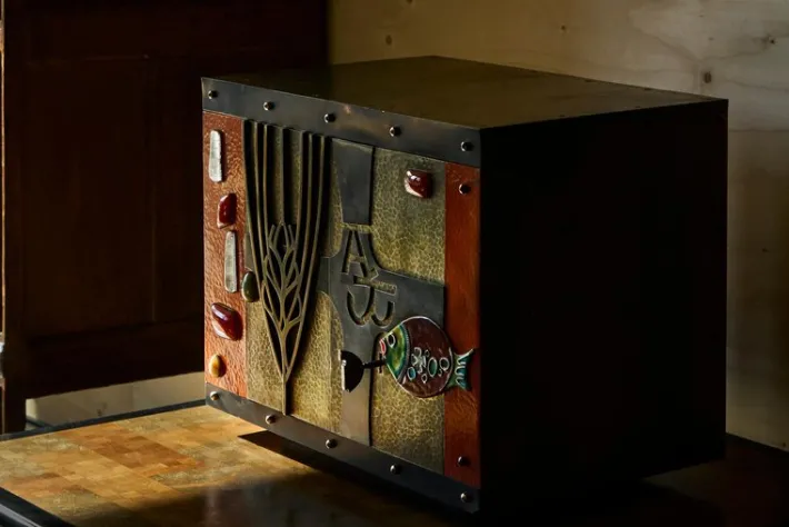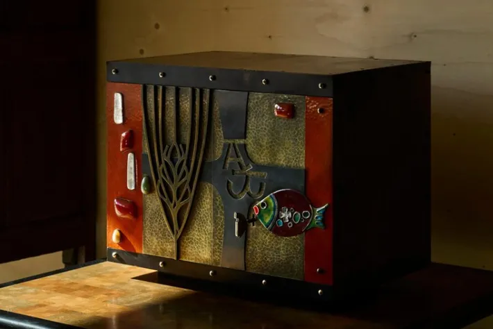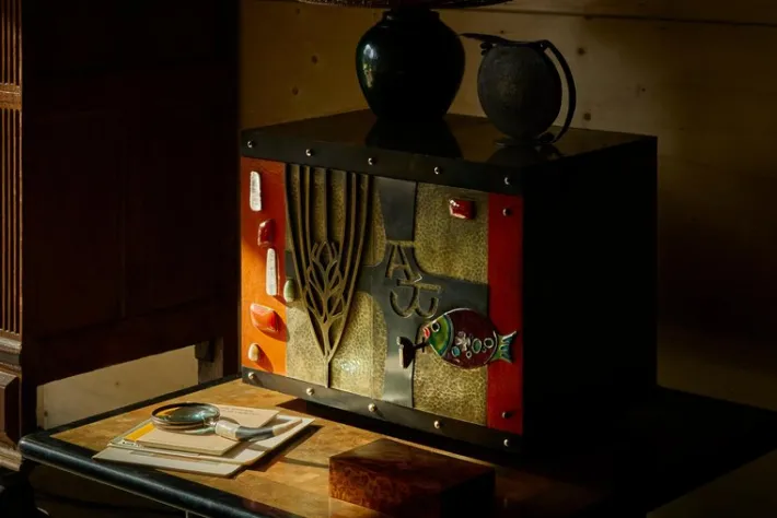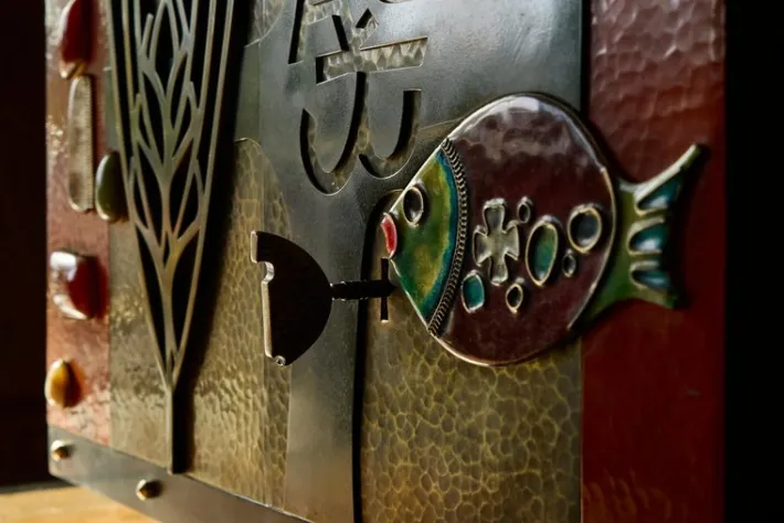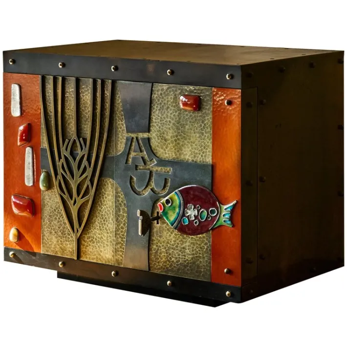 Wonderfully executed in brass, hand hammered metals, inlaid enamel and gemstones. Features a sculptural and tactile facade – in ways reminiscent of works by American artist and furniture maker Paul Evans – full of stunning and interesting details. Please also note the heavy quality fish-shaped key. A heavy duty piece with functional lock. The inside is cladded with gold painted metal. It comes in a very original condition with some signs of wear and use – relatable to the age of the piece. Furthermore the materials have gained a wonderful patina over time – most notable the brass on the sides, top and in the facade.