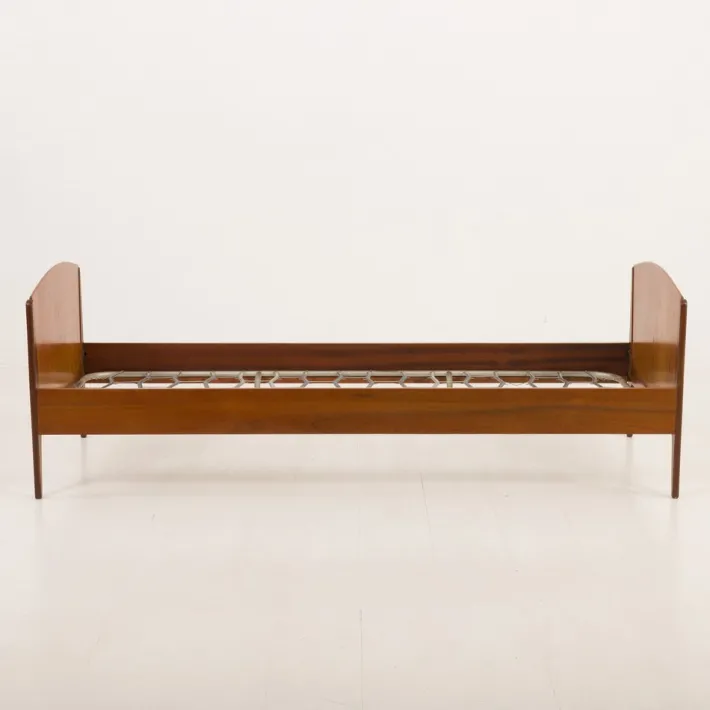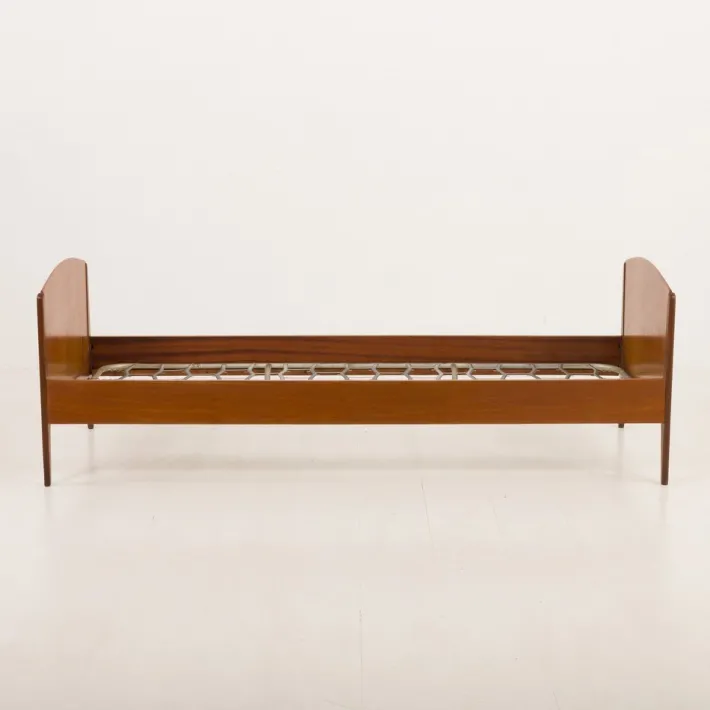 The original spring frame is in excellent condition and, despite the passage of time, still performs its function. The wooden frame has been cleaned and treated with protective oil to enhance the grain. All visible signs of aging, such as the patina on the metal frame, are entirely natural and do not detract from its aesthetic. The authenticity of the bed’s origin is confirmed by the manufacturer’s emblem attached to the frame.