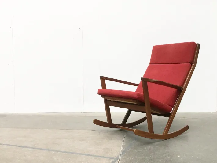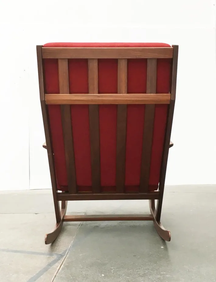 A very no-nonsense design with clean lines. The individual timber elements of the chair showing the most part a rectangular cross-section. The frame is aligned downwards in a point and this chair the distinctive V-shape. The red upholstery harmonizes perfectly with the wood. The runners are especially running fine. Inside view, they seem heavy and solid, in the front view to show the actual intricacy. Back and forth they run almost from zero.
