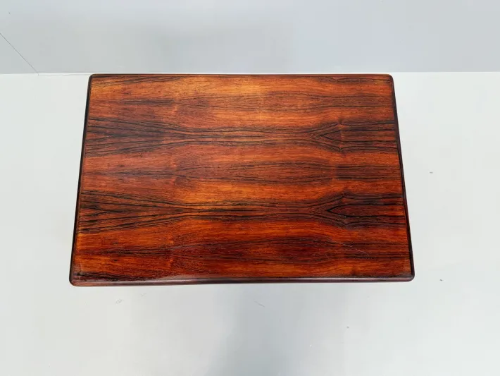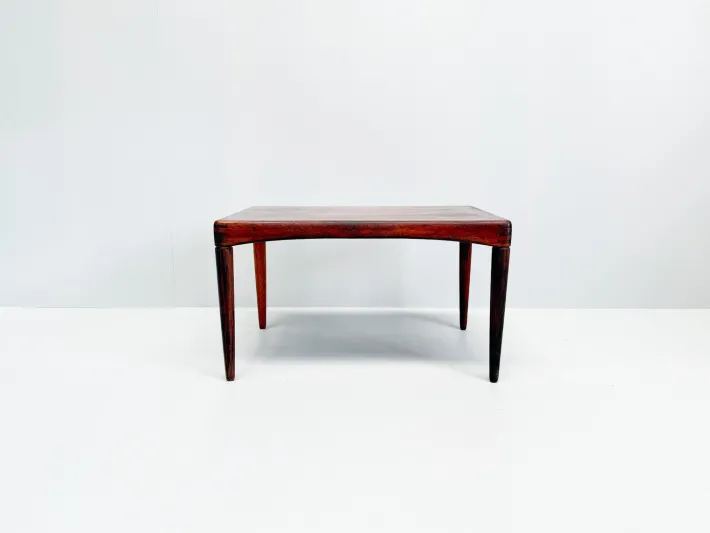 The table is crafted from rich rosewood, featuring beautiful grain patterns and refined joinery details on the corners. Its tapered legs and minimalist form highlight the timeless Scandinavian design aesthetic.