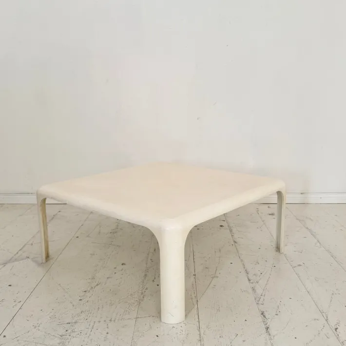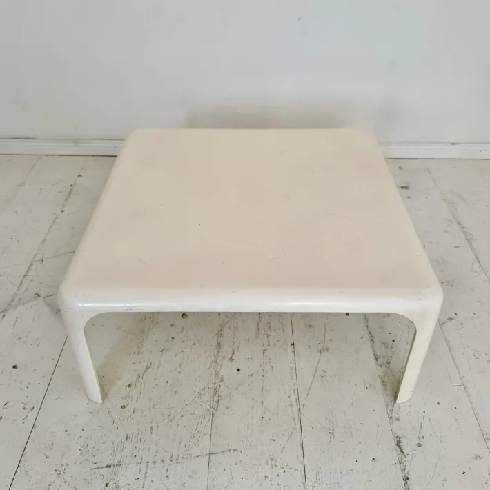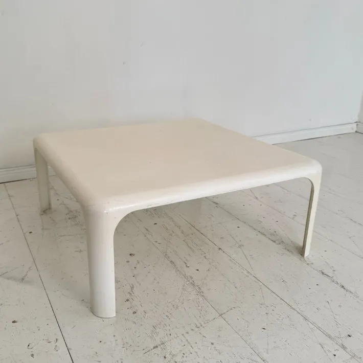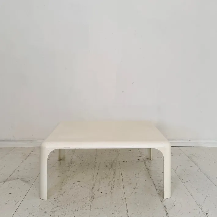 The table features a square top resting on elegantly curved legs that merge seamlessly into the structure, giving it a lightweight yet architectural presence. Produced in molded plastic, the Demetrio 70 was celebrated for its versatility, durability, and modern aesthetic, making it a design icon of the 1970s. The minimal yet impactful silhouette reflects Magistretti’s talent for combining function with refined simplicity. This piece remains highly collectible today, both as a functional coffee table and as an authentic statement of Italian design history.