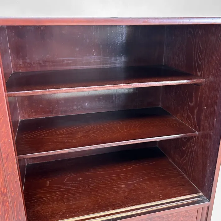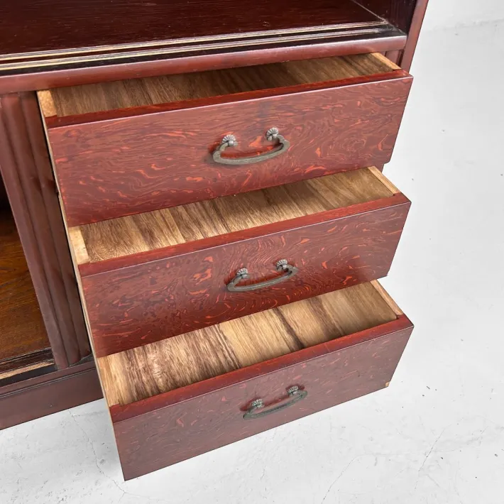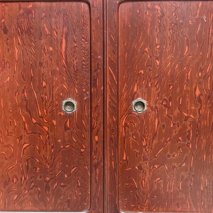 The piece is finished in a deep reddish wood veneer with a vivid, almost flame-like grain pattern that highlights the natural beauty of the material. The contrast between the warm exterior tones and the darker interior surfaces lends the cabinet a refined, understated presence.