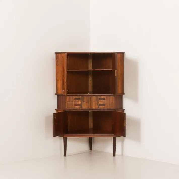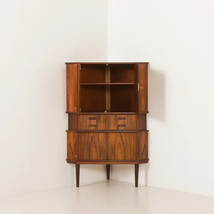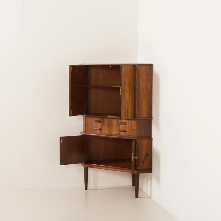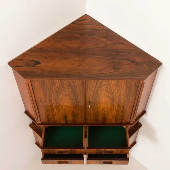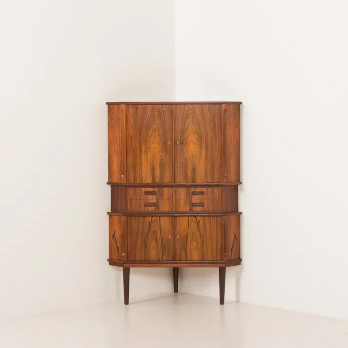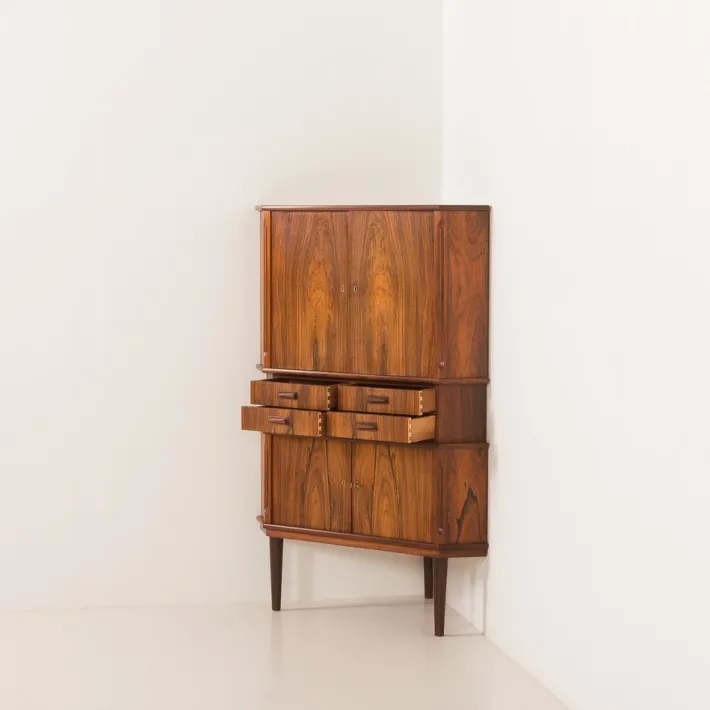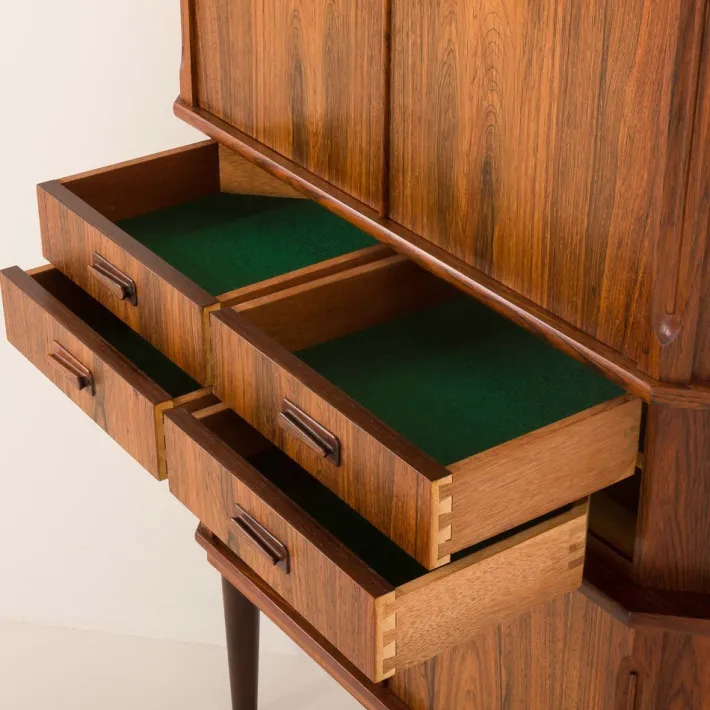 The interior features two spacious cabinets, bigger one with a shelf, and in combination with a set of four drawers with beautiful sculptured solid rosewood handles, providing flexible storage options for a variety of items, from books and tableware to decorative pieces, regardless of their size. A lockable door, complete with a key, ensures the secure storage of your belongings. Tapered solid legs—the hallmark of Scandinavian design—are detachable, providing more convenient transport.