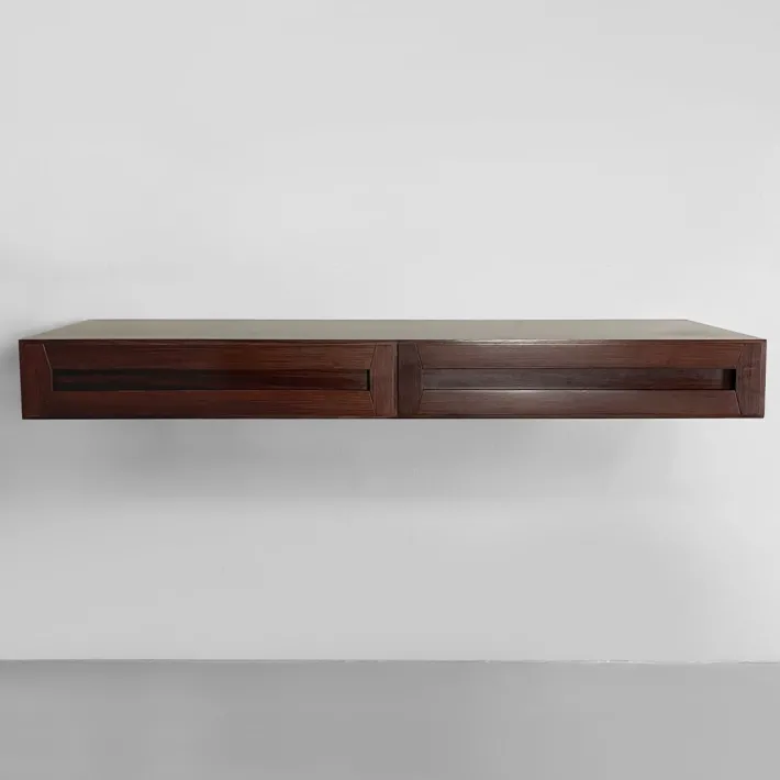 Wall-mounted console table with a rectangular top, made entirely of wood. It features two rectangular drawers on the front.