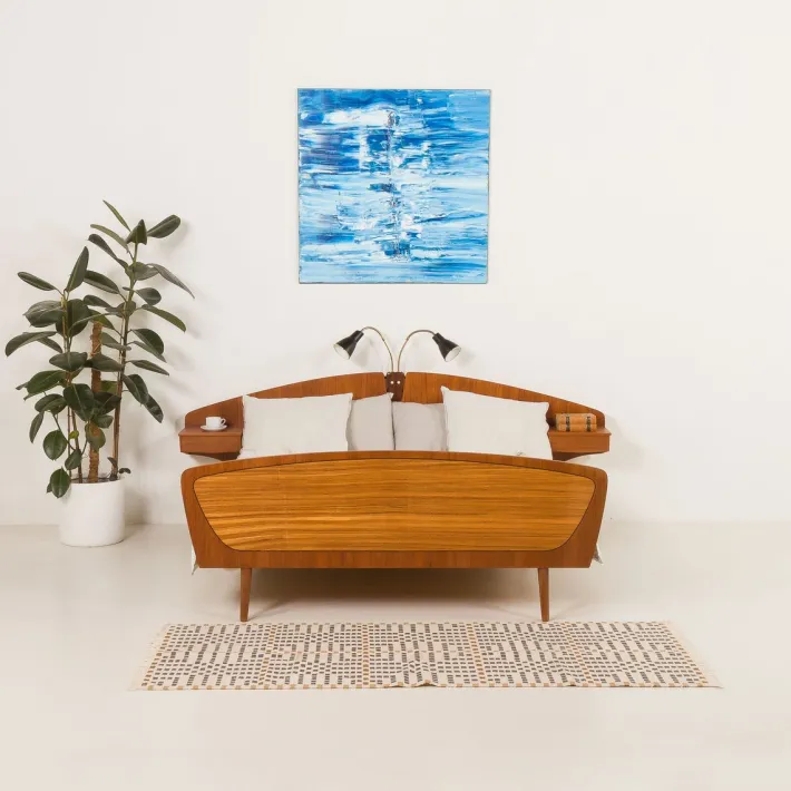 The wood was sanded and treated with professional compounds to reinforce it and enhance its natural beauty, and covered with few layers of Danish oil to preserve it.. We changed a lamp cables. Frame is in excellent condition and will serve for many years to come. One bedside table has a small burn mark on the countertop, it does not compromise the estethics of the piece, just confirms its vintage provinance. Exceptional choice for any stylish and design-focused interior.
