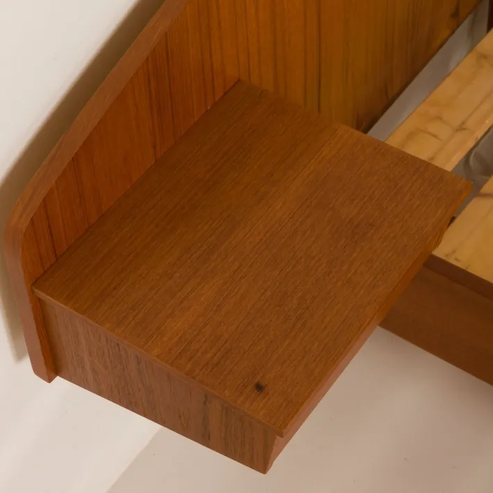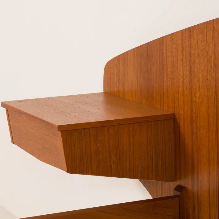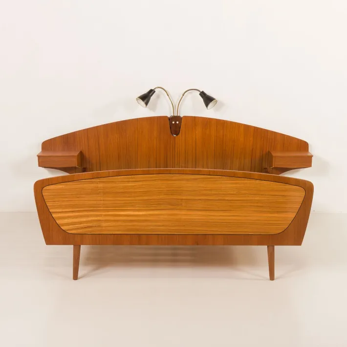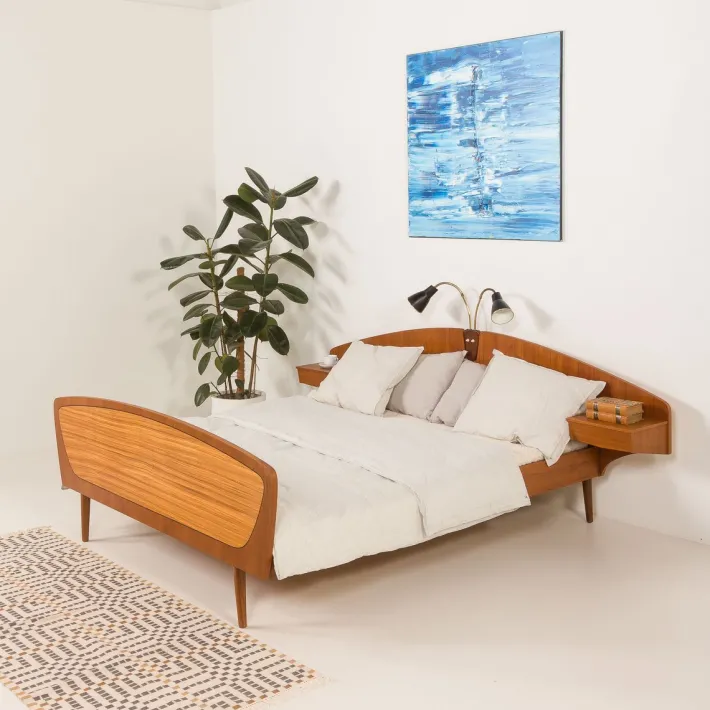 The bed has rounded silhouette with a teak veneered frame showcasing the warm tones and rich grain. Integrated floating bedside tables, each equipped with a single drawer, offer convenient storage without compromising the bed’s clean lines. A distinctive feature of this bed is the round teak headboard and footboard, emphasizing the natural beauty of the wood while ensuring durability, and functional original night lamp with two separate all-direction- adjustable shades. Perfect for reading.