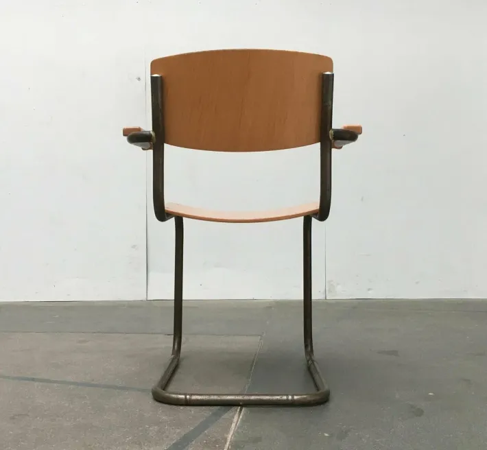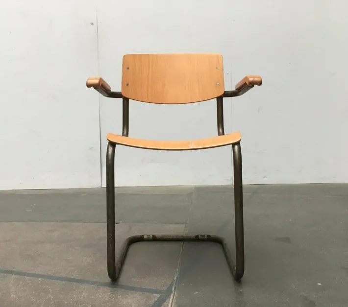 The S43 is a classic among tubular steel furniture. Simple and timeless. In these specimens the steel tube is untreated and has a wonderful patina. The connection points to the armrests are visibly different. The construction and workmanship remains legible. The armrests are made of solid wood.