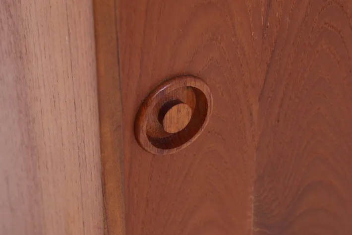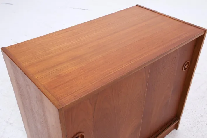 FEATURES * High-quality workmanship * 2 shelves * 2 sliding doors * Material: Teak DIMENSIONS & CONDITION The chest of drawers is in good condition with age-related signs of wear (see pictures) Height: 70 cm Width: 80 cm Depth: 44 cm