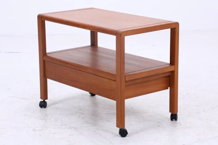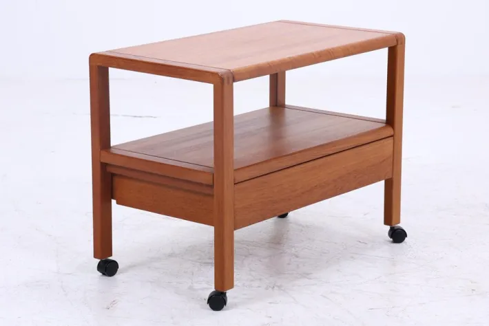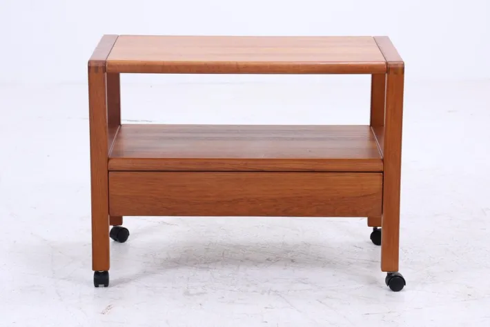 FEATURES * High-quality workmanship * with castors * 2 shelves * 1 drawer * Material: Teak DIMENSIONS & CONDITION The side table is in good condition with age-related signs of wear Height: 61 cm Width: 80 cm Depth: 45 cm