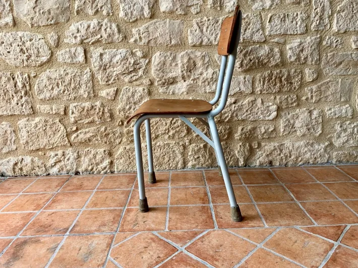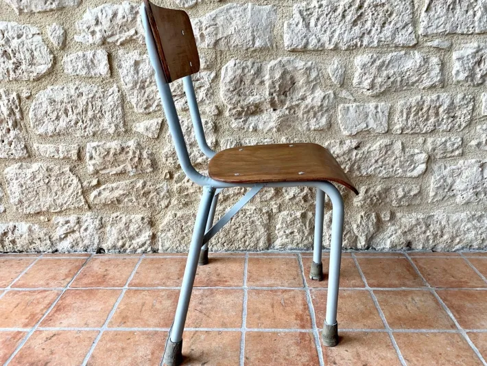 The chair’s seat and back rest, are made of wood and have been re-done with a teak finish.