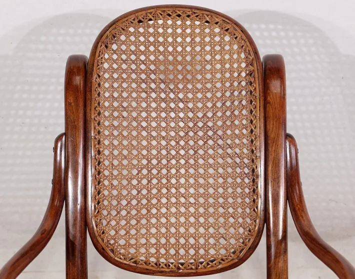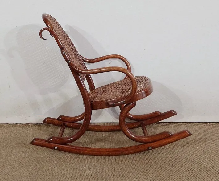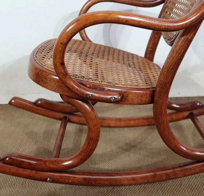Composed of a cane back and seat, in perfect condition, this solid rocking chair has a patina redone to match the original model.