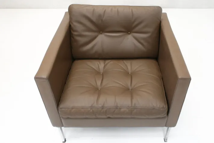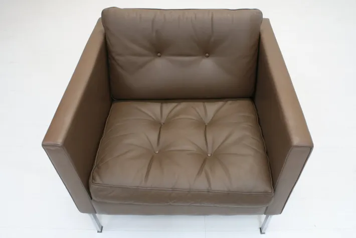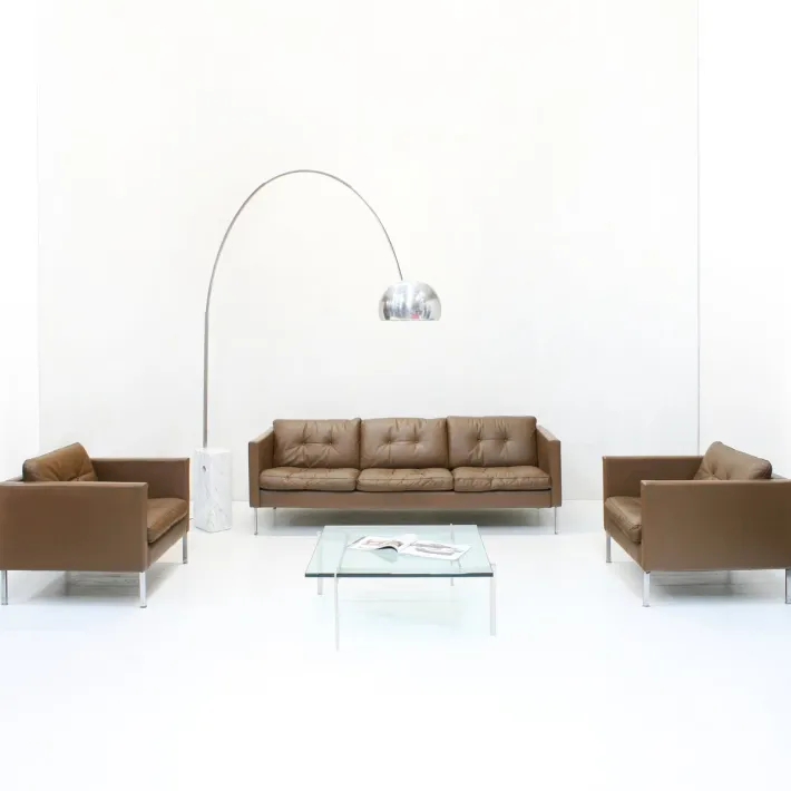 The set is upholstered in its original brown leather which has a nice patina and some greying. Loose foam filled buttoned cushions and solid chrome-plated steel legs.