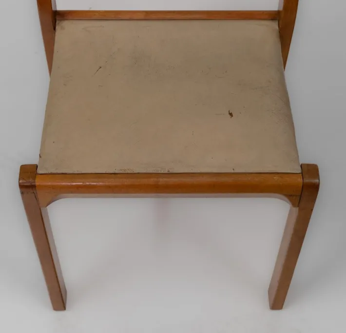 The chair has the original patina, with the birch being waxed, showing marks and loss to the finish in places. The leather has some signs of use as expected, with scuffs, marks and minor losses.