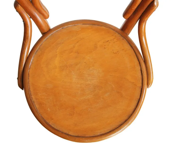 This chair nicely shows the Thonet renowned technique of wood bending. There is no decoration on any part of the wood but the very expressive organic form of the backrest and its two side supports are the main design feature. Using a round seat was a popular solution at Thonet, it not only works with the curves but also made sitting on the chair comfortable.