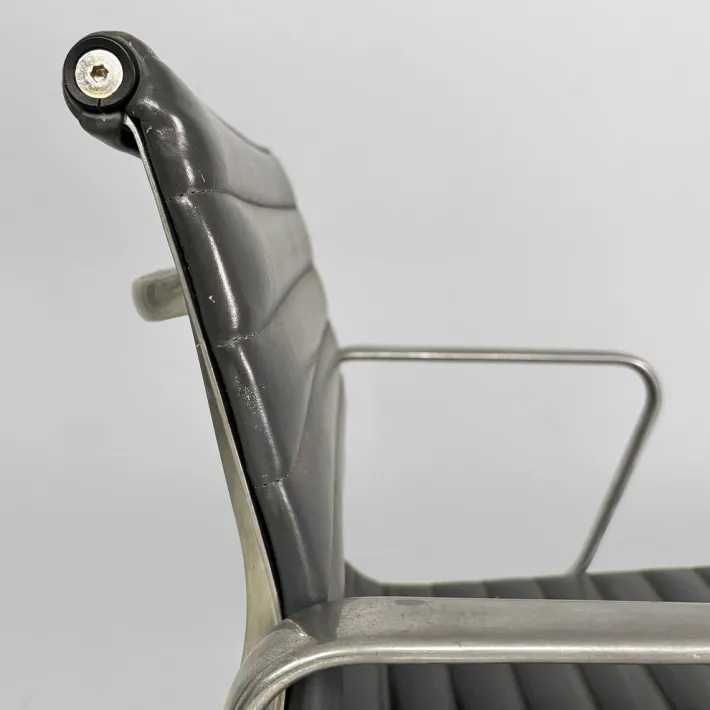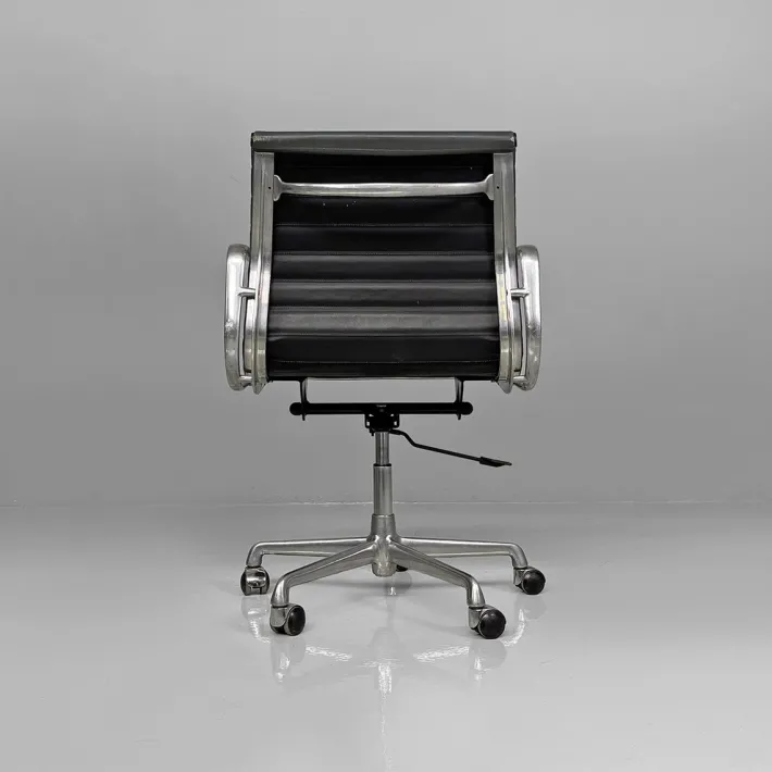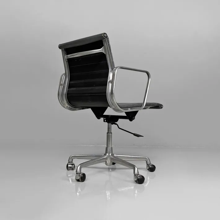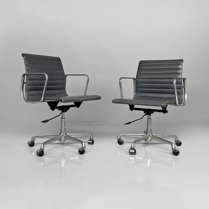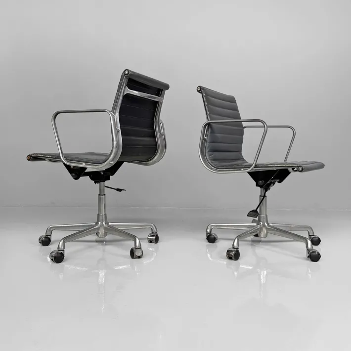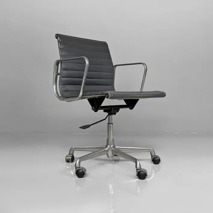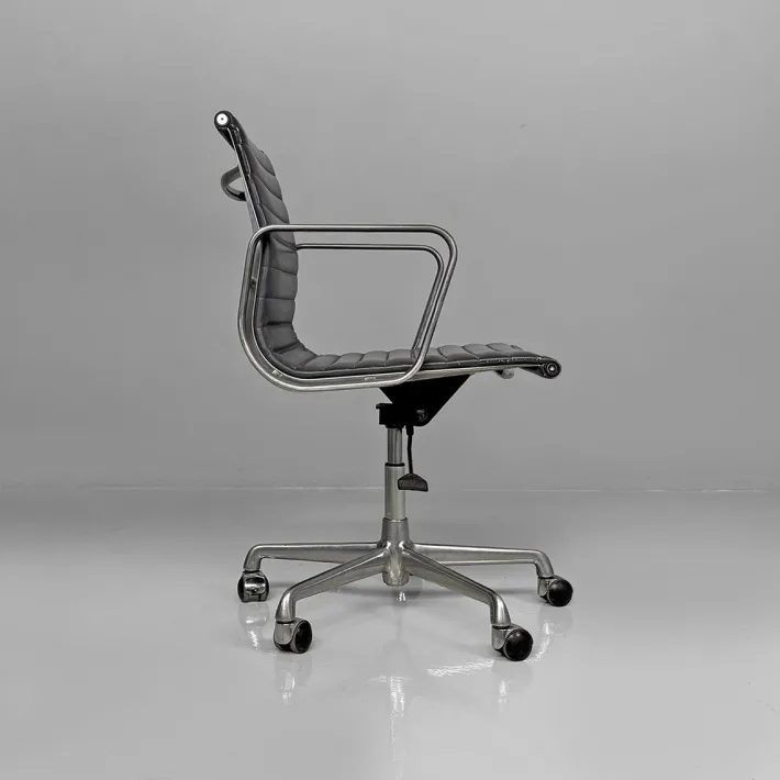 Office chairs, model EA108, on casters. The seat and backrest are upholstered in dark grey leather with horizontal stitching. The frame is made of silver-plated metal and features five spokes, each with a corresponding number of casters. The chair features a lever for adjusting its height.