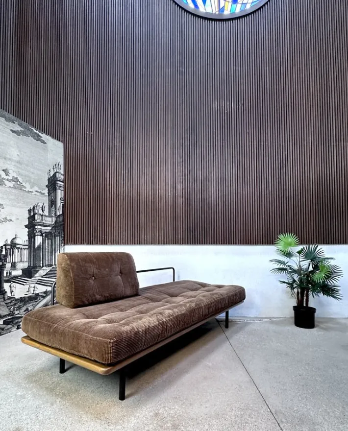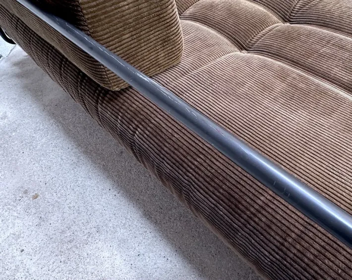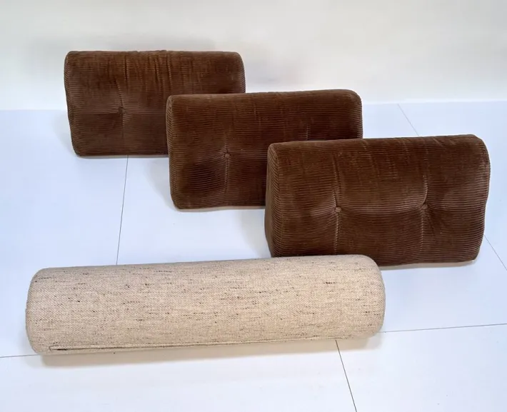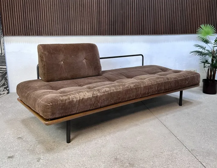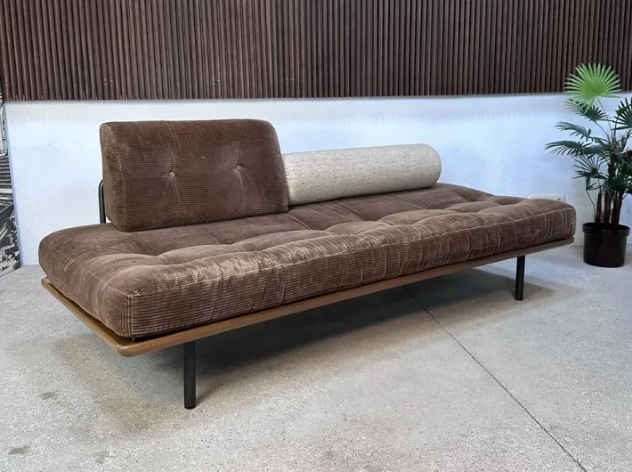 Mattress and 3 high-quality modular backrest elements are covered with cord fabric, completed by 1 long bolster in woolen fabric.