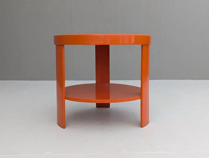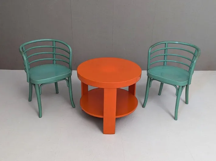 Crafted in the 1930s by Thonet, the B 246 chairs (labeled) feature low horizontal slatted backs and gracefully arched bentwood frames, combining visual rhythm with ergonomic modesty. The T 142 table, finished in bold red-orange lacquer, echoes the sculptural integrity of Frank’s work with its wide top and cylindrical leg base.