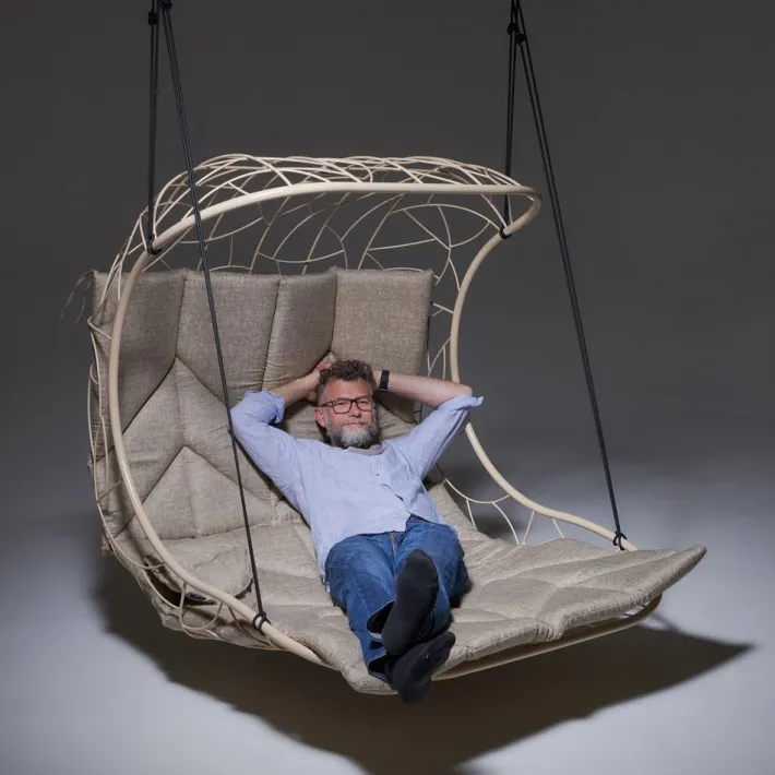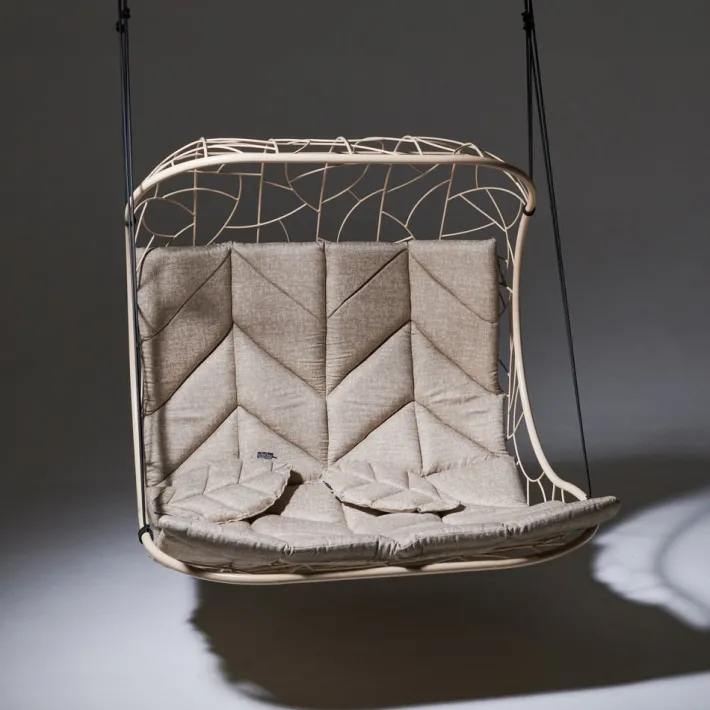 Fluid and organic, the Big Wave double swing seat is cozy and spacious. Its gentle motion is calming and relaxing. The pattern detail is inspired by nature and reminiscent of the veins in leaves, tree branches intersecting, the patterns in dragonfly wings, cracked soil and natural textures.