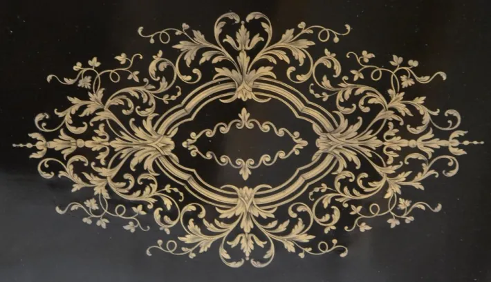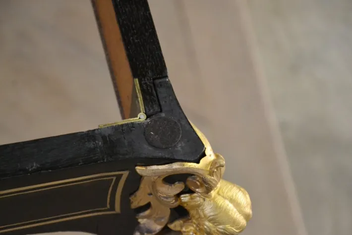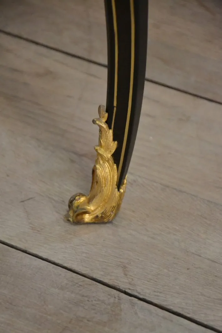 Decor of brass foliage inlaid on the crosspieces, arched feet and on the tray.