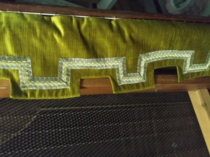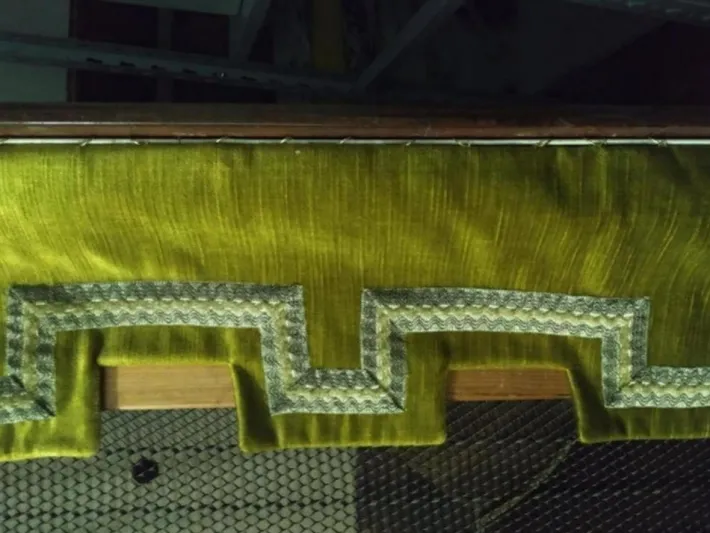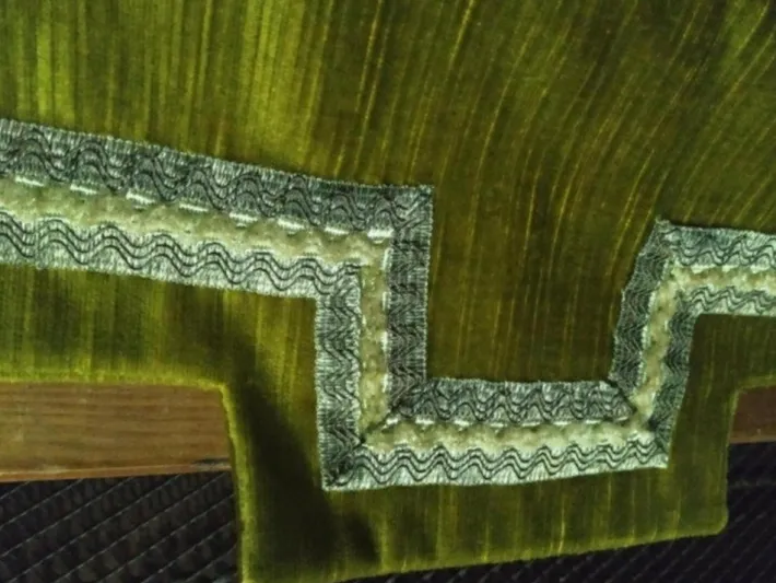 from the 19th Century, In mahogany wood with appliqués in gilded bronze and classical figures. Fluted columns with Corinthian capitals. Ceiling lined with green velvet.