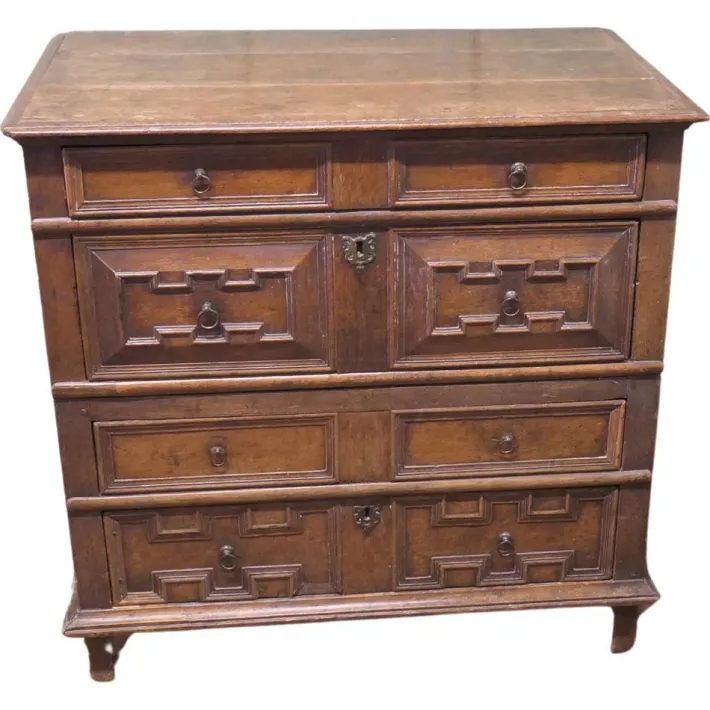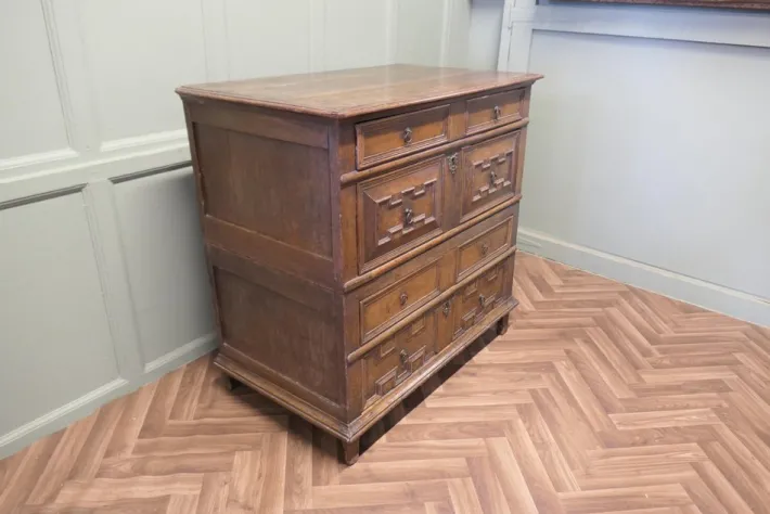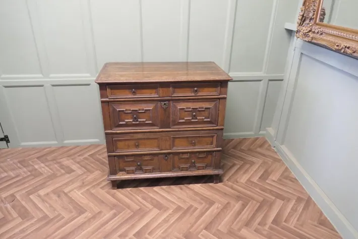 The chest has 4 long drawers, the drawer fronts are trimmed with geometric mouldings, in the style of their time