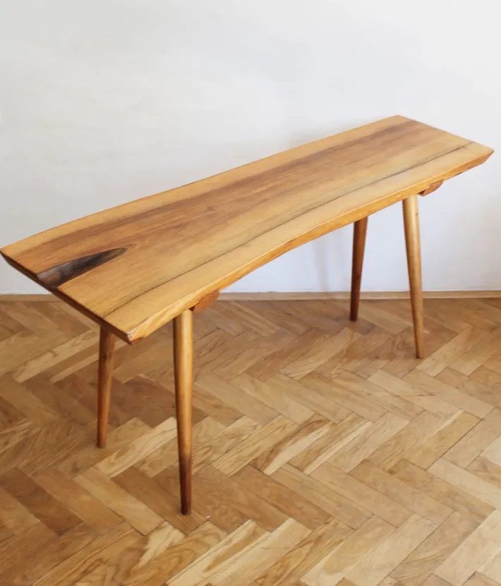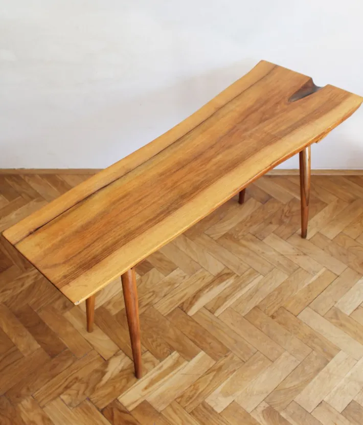 Supporting the top are four solid oak legs, tapered and angled in true Mid-Century Modern style. The clean geometry of the legs contrasts beautifully with the irregular, sculptural top that stretch from 33 to 43 cm, creating a perfect balance between modern design and organic form. The proportions are elegant and versatile: ideal as a side table for books, flowers, or decorative objects, yet equally suited for serving coffee or tea. with over 60 years of history, the table still radiates authenticity, craftsmanship, and quality, enhanced by the gentle patina that only time can create.