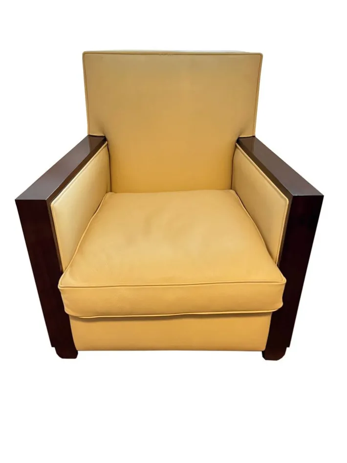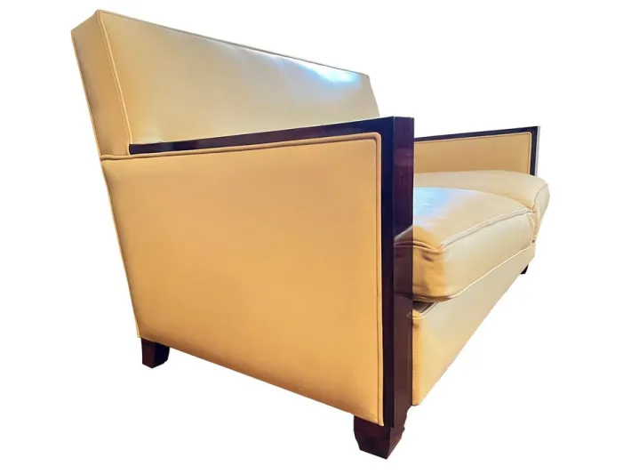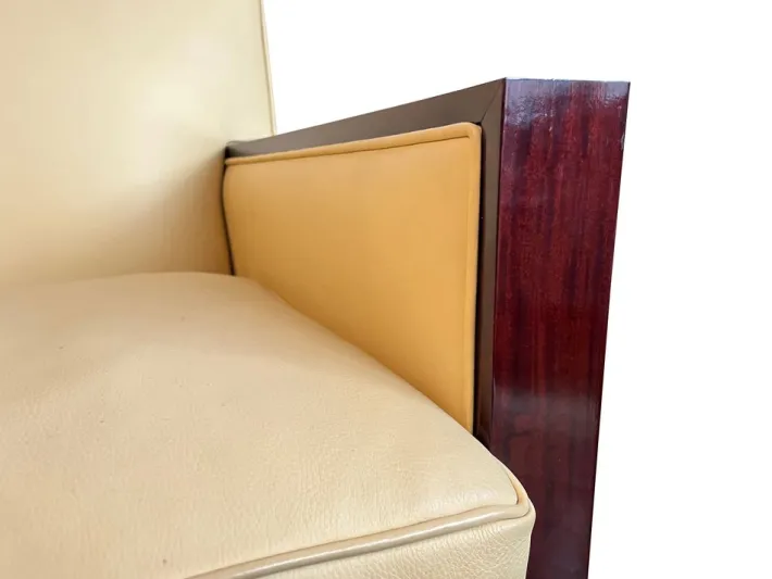 This original Art Deco seating set around 1930, consisting of two clothes control and a double seating bench, was newly moved into the restoration with bei-leather. The armrests of the individual sitting elements were polished dark red brown. Due to the timeless design, the seating group skilfully adapts to every room and ensures a coherent overall picture.