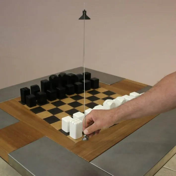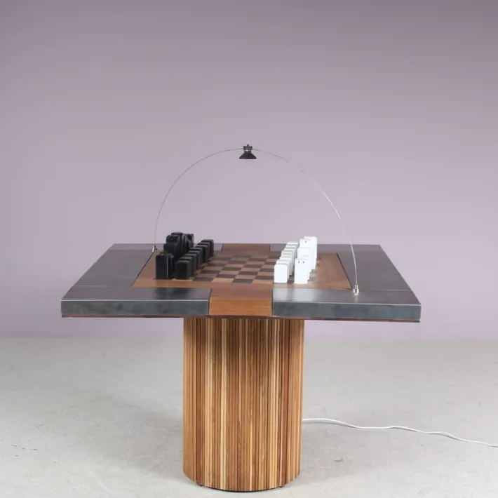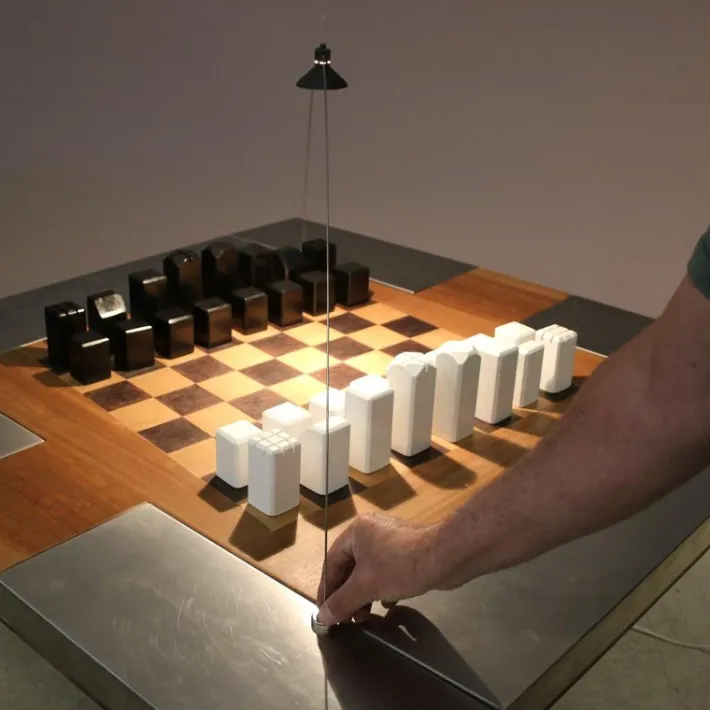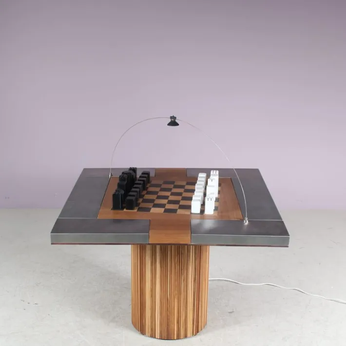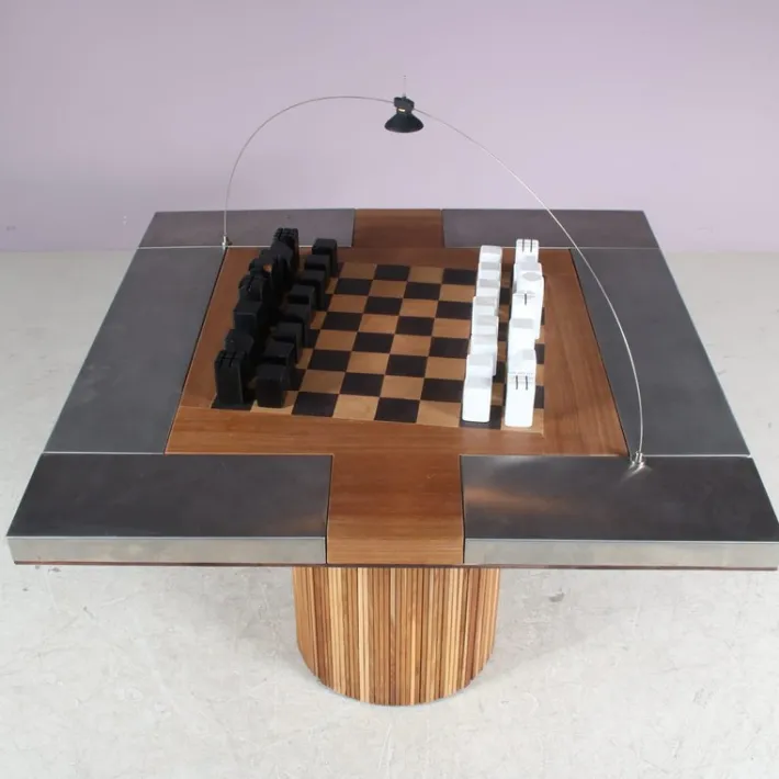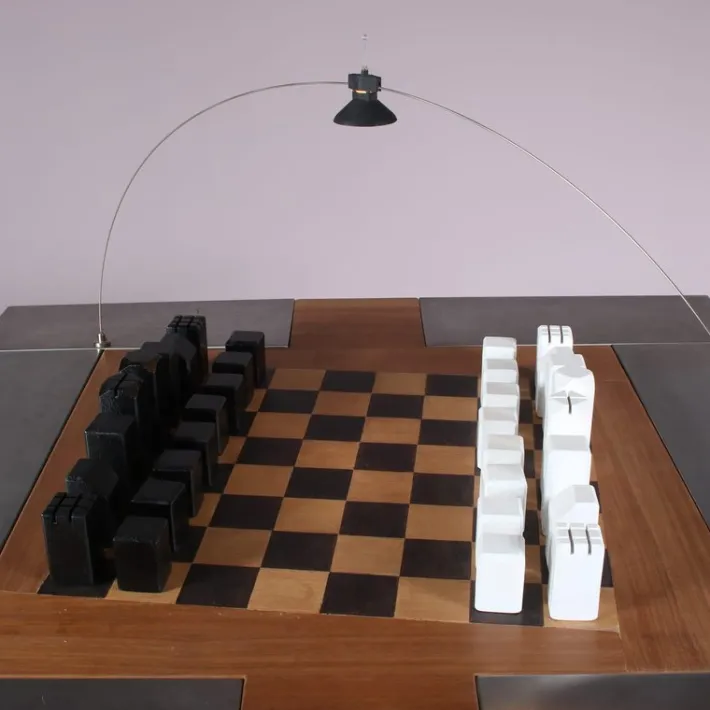 The wire metal arc forms the conductor for electricity that is connected to the metal parts of the table, allowing the light to work. It switched on and off through a touch system under the top. The inlaid chessboard at the center of the top is tilted, as the design was made to accompany a more relaxed playing position. The minimalist chess pieces are hand made of white and black painted wood. All together this piece exudes quality and creativity, a fantastic find for any chess or design enthusiast! Only made once , with the intention of it being a one of a kind piece, celebrating the design, technology and artistic view of those who worked on it. The piece comes with a signed certificate of authenticity by Duccio Trassinelli. It remains in very good condition with only very minor wear consistent with age and use, preserving a fantastic patina!