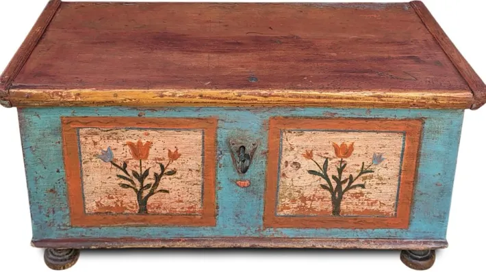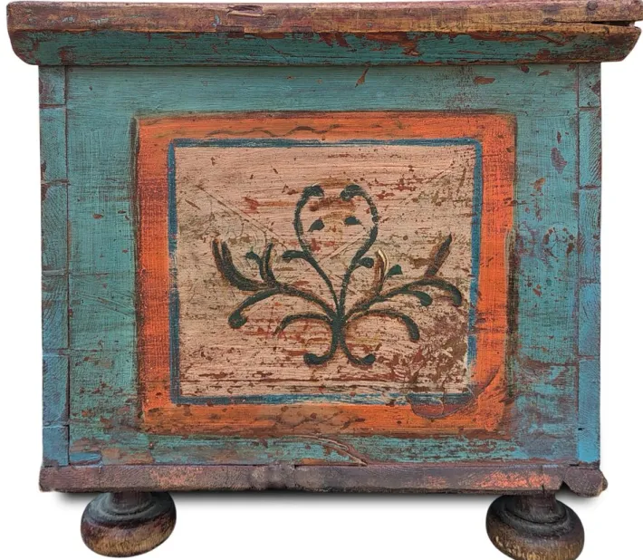 This chest, beyond its practical storage role, conveys strong symbolic and decorative value, reflecting the identity and traditions of Alpine households.