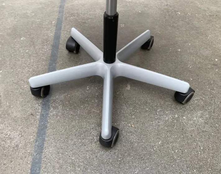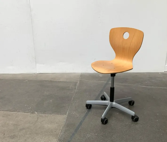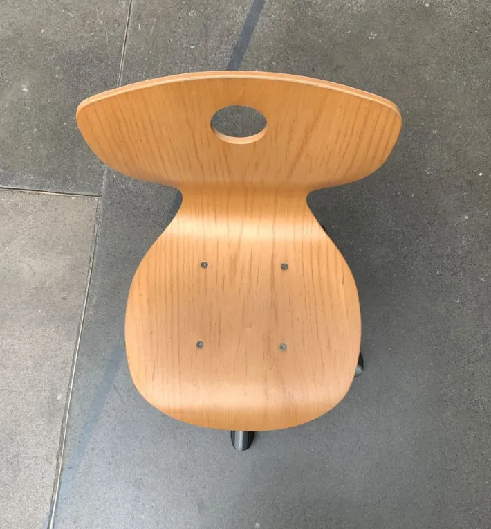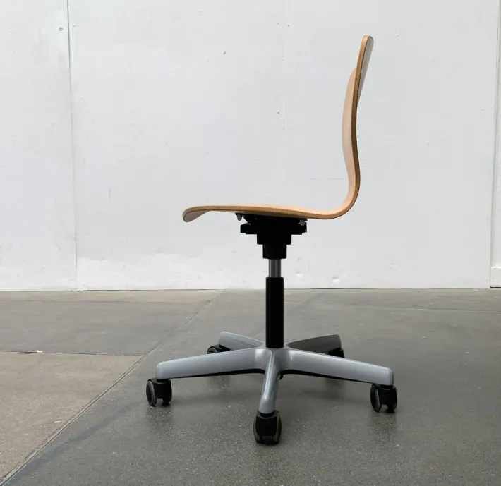 The seat shell is made of beech plywood and ergonomically contoured. The most distinctive detail of the pantoserie is the functional handle hole in the backrest. The swivel chair is continuously adjustable via a gas spring. The seat shell is connected to the shaft via a seesaw mechanism and thus supports a “dynamic” sitting. The star foot is of heavy quality and even from below with an elaborate cover.