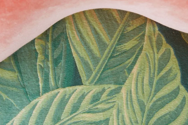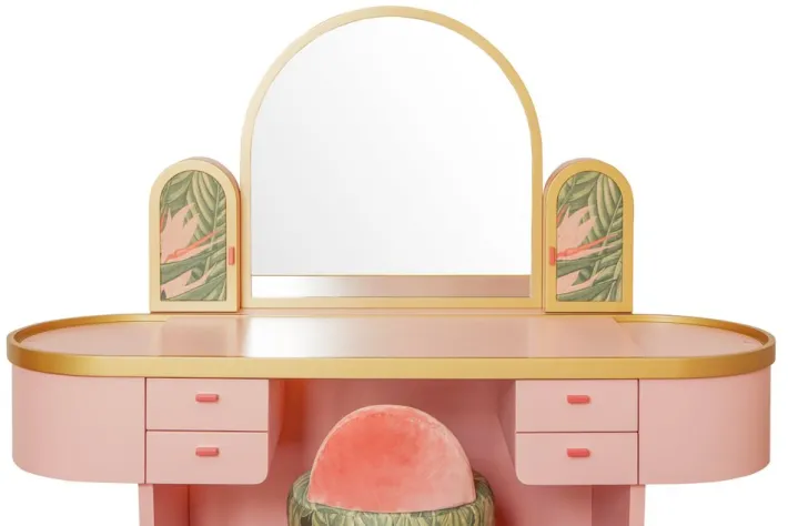 Its matching pouff is made entirely of pink velvet, with the seat decorated with the same tropical leaves present on the vanity. It is round in shape and has a small backrest for comfortable seating.