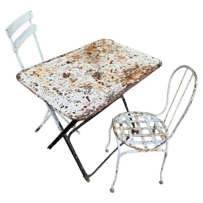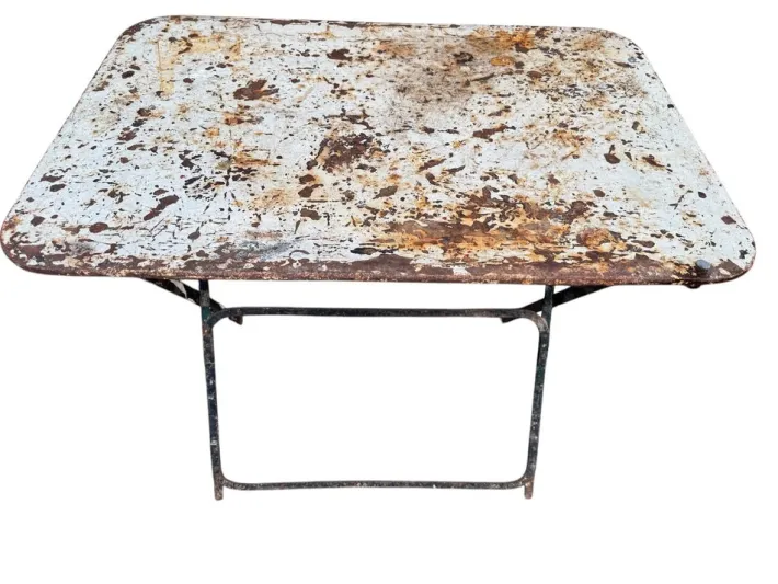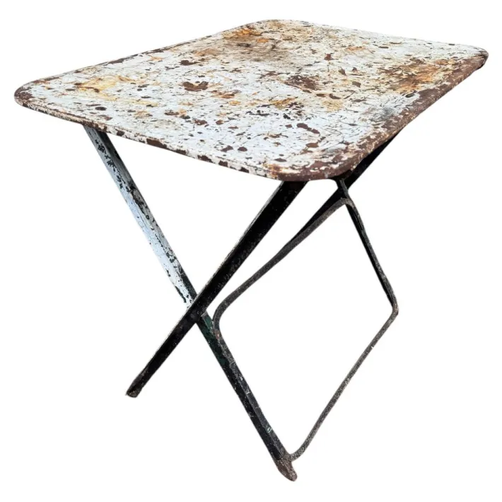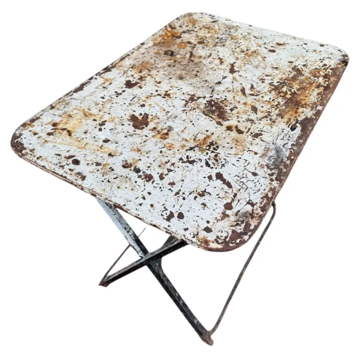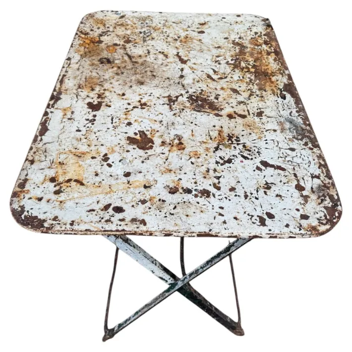 Created industrially around the middle of the 20th century, it consists of a rectangular top and an X-shaped base, all in metal.